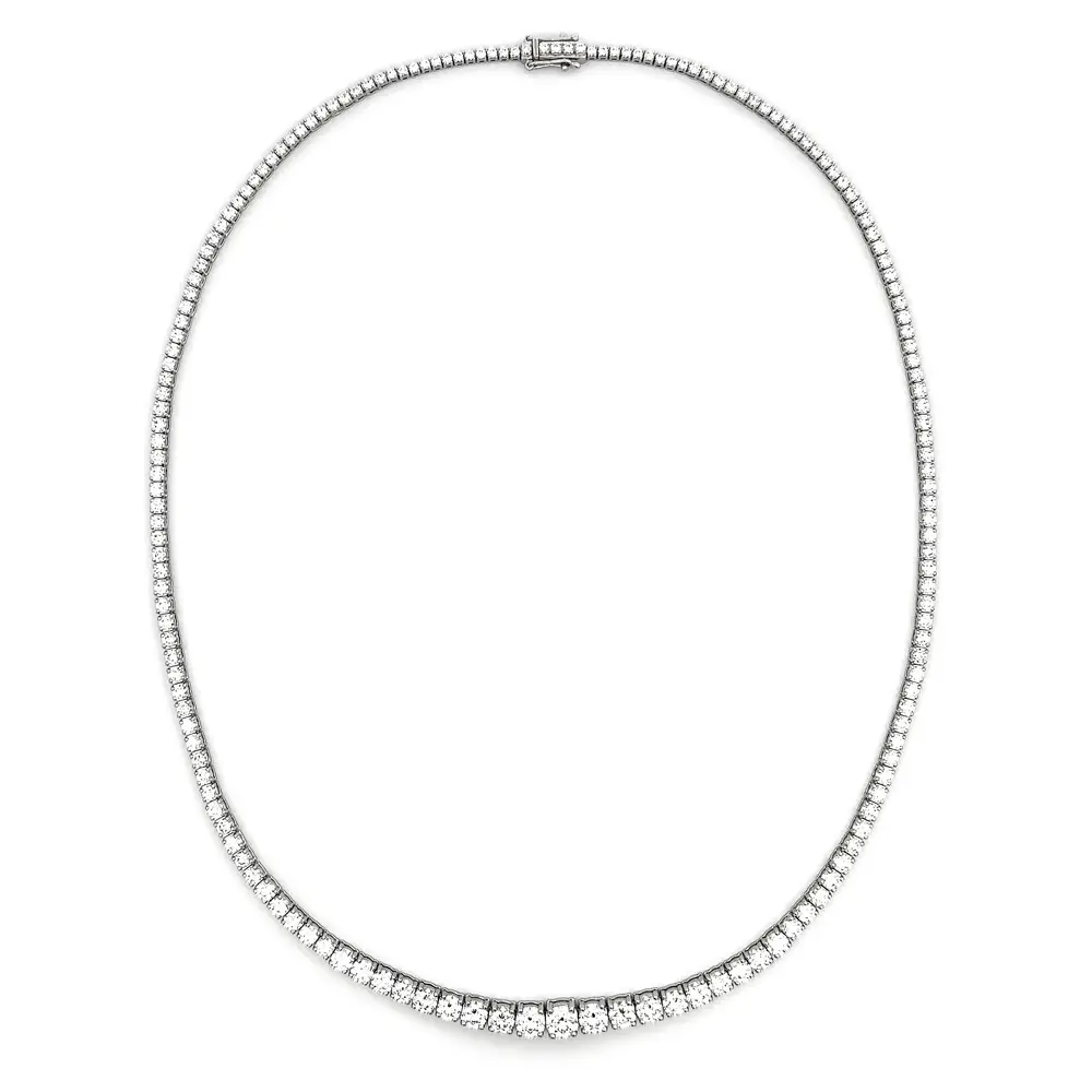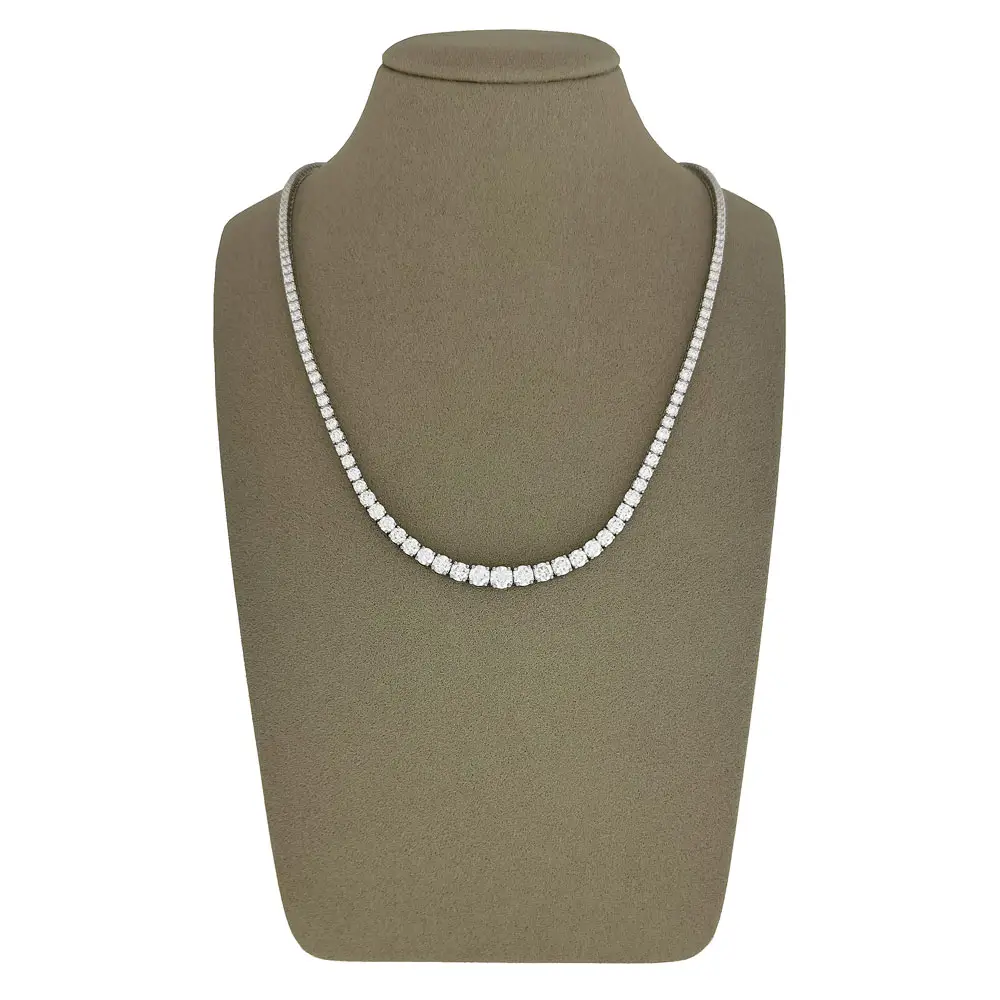 Diese Tennis-Halskette von Beny Jewellery ist eine glänzende Hommage an Licht und Luxus – jedes Element gefertigt aus hochglänzendem 18 kt (750/1000) Weißgold, entworfen, um Augenblicke in zeitlose Eleganz zu verwandeln. Mit einer Gesamtkarat-Gewicht von 8,43 ct symbolisiert das Schmuckstück das Streben nach Perfektion und meisterhafter Verarbeitung.
