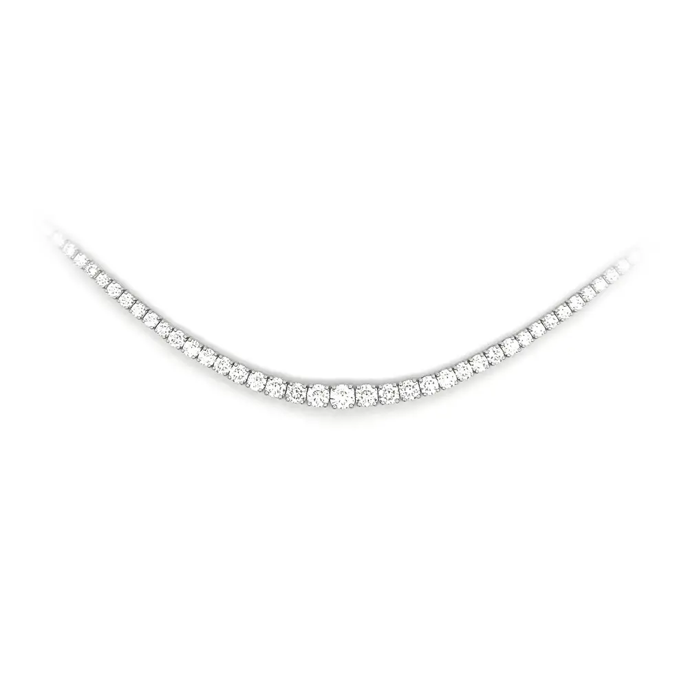 Die rund geschliffenen Diamanten – Farbe G, Reinheit VS – bilden eine nahtlose Reihe aus funkelndem Glanz, die den Hals wie ein strahlender Kreis umgibt. Das polierte Weißgold betont den Kontrast zwischen Metall und Stein und schafft einen markanten visuellen Eindruck mit bleibendem Stil.