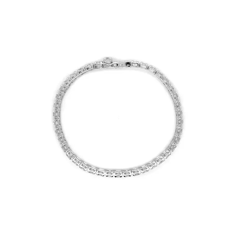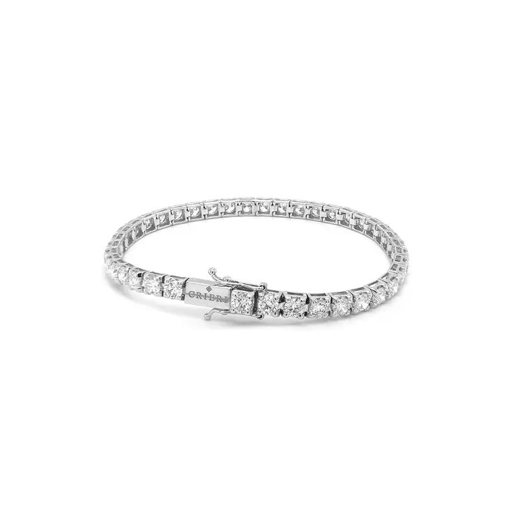 Das Schmuckstück ist mit natürlichen weißen Diamanten im runden Brillantschliff (Round) besetzt, mit einem Gesamtgewicht von 6,45 Karat, der Farbe G–H und der Reinheit VS. Jeder Stein ist sorgfältig von Hand gefasst, um eine ununterbrochene Linie aus funkelndem Licht zu erzeugen – ein Markenzeichen des klassischen Tennisarmbands.