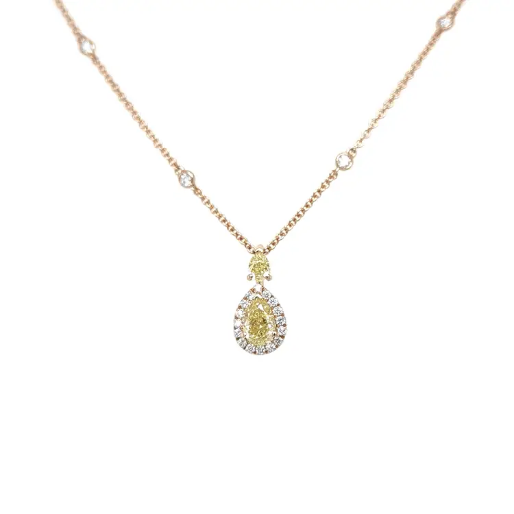 Im Zentrum erstrahlt ein natürlicher Fancy-Yellow-Diamant, 0,71 ct, Birnenschliff, 7,00 × 4,60 mm, ergänzt von einem kleineren natürlichen Fancy-Yellow-Diamanten, 0,23 ct, 4,10 × 3,10 mm, ebenfalls birnenförmig. Ihr warmer Ton kontrastiert wunderbar mit einem zarten Pavé aus 26 natürlichen weißen Diamanten insgesamt 0,40 ct, Rundschliff (1,00–2,00 mm), Reinheit VS, Farbe F. Die präzise Kombination farbiger Diamanten ergibt ein raffiniertes Schmuckstück, das Weiblichkeit, Eleganz und Einzigartigkeit unterstreicht.