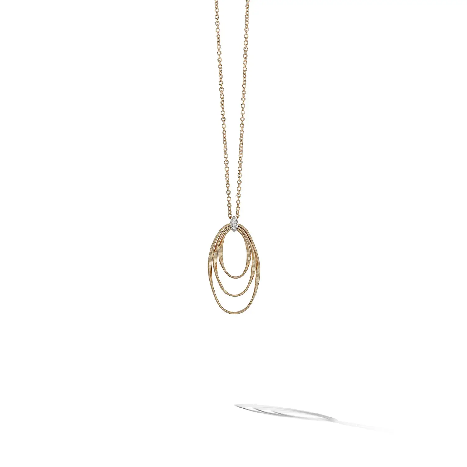Dieser elegante Anhänger aus der Marrakech Onde-Kollektion von Marco Bicego besteht aus 18 kt Gelbgold (750/1000)und ist mit der charakteristischen mattierten Oberfläche versehen, welche die handgearbeiteten, geschwungenen Linien des Designs besonders betont. Mit seinen Maßen — 19,35 mm Breite, 2,60 mm Höhe und 37,35 mm Gesamtlängeinklusive Öse — hängt er an einer 45 cm langen Kette und wirkt besonders harmonisch am Dekolleté.