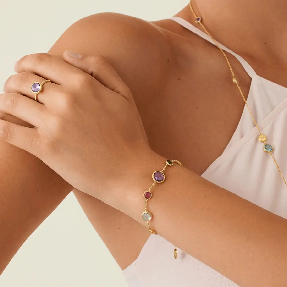 Jeder Stein wird sorgfältig ausgewählt und von Hand facettiert, um seinen einzigartigen Charakter zu betonen. Gefasst in 18kt von Hand bearbeitetem Gold entsteht ein faszinierender Kontrast zwischen der Farbe und der samtigen Oberfläche des Metalls. Die Kollektion umfasst Ohrringe, Halsketten, Armbänder und Ringe, die kombiniert und übereinander getragen werden können – für eine raffinierte, aber spielerische Wirkung.