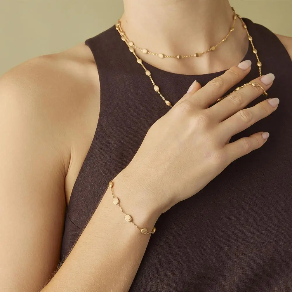 Jedes Stück wird in den Ateliers von Marco Bicego von Hand gefertigt und mit der Bulino-Handgravur versehen, die der Oberfläche eine matte, seidige Wirkung verleiht. Die filigranen Goldplättchen sind durch luftige Ketten verbunden, die sich natürlich mit dem Körper bewegen. Die Siviglia-Kollektion umfasst Halsketten, Armbänder, Ohrringe und Ringe, oft ergänzt durch Diamanten für noch mehr Raffinesse.