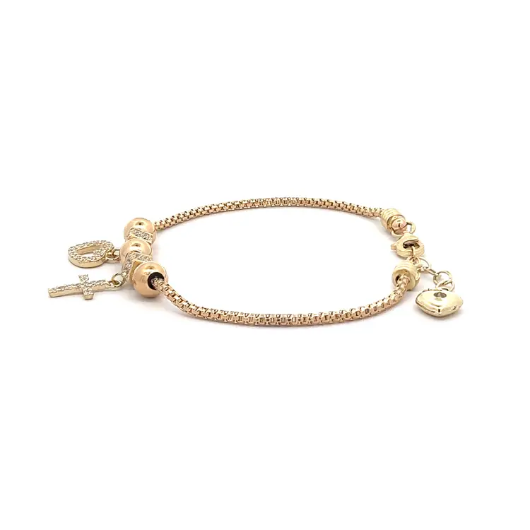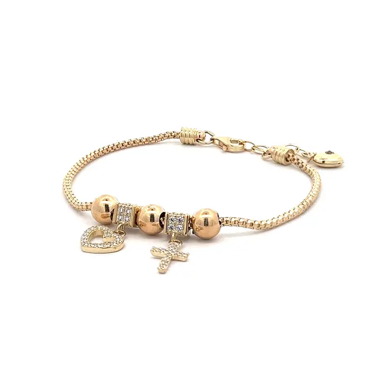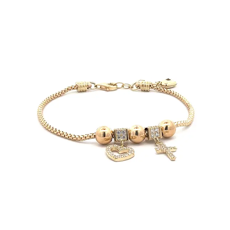 Goldarmband mit leuchtenden Steinen und Symbolik für Liebe und Glaube