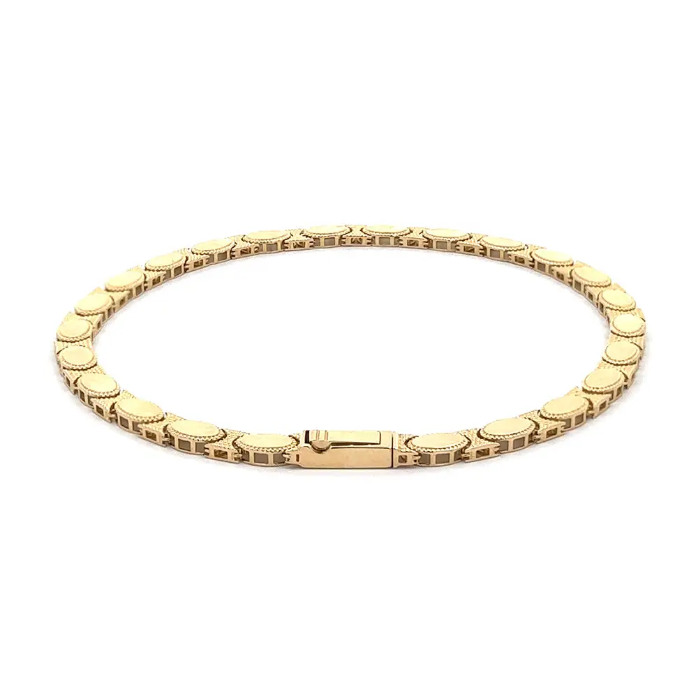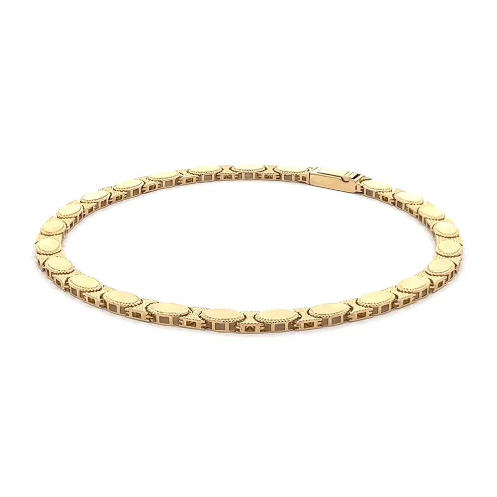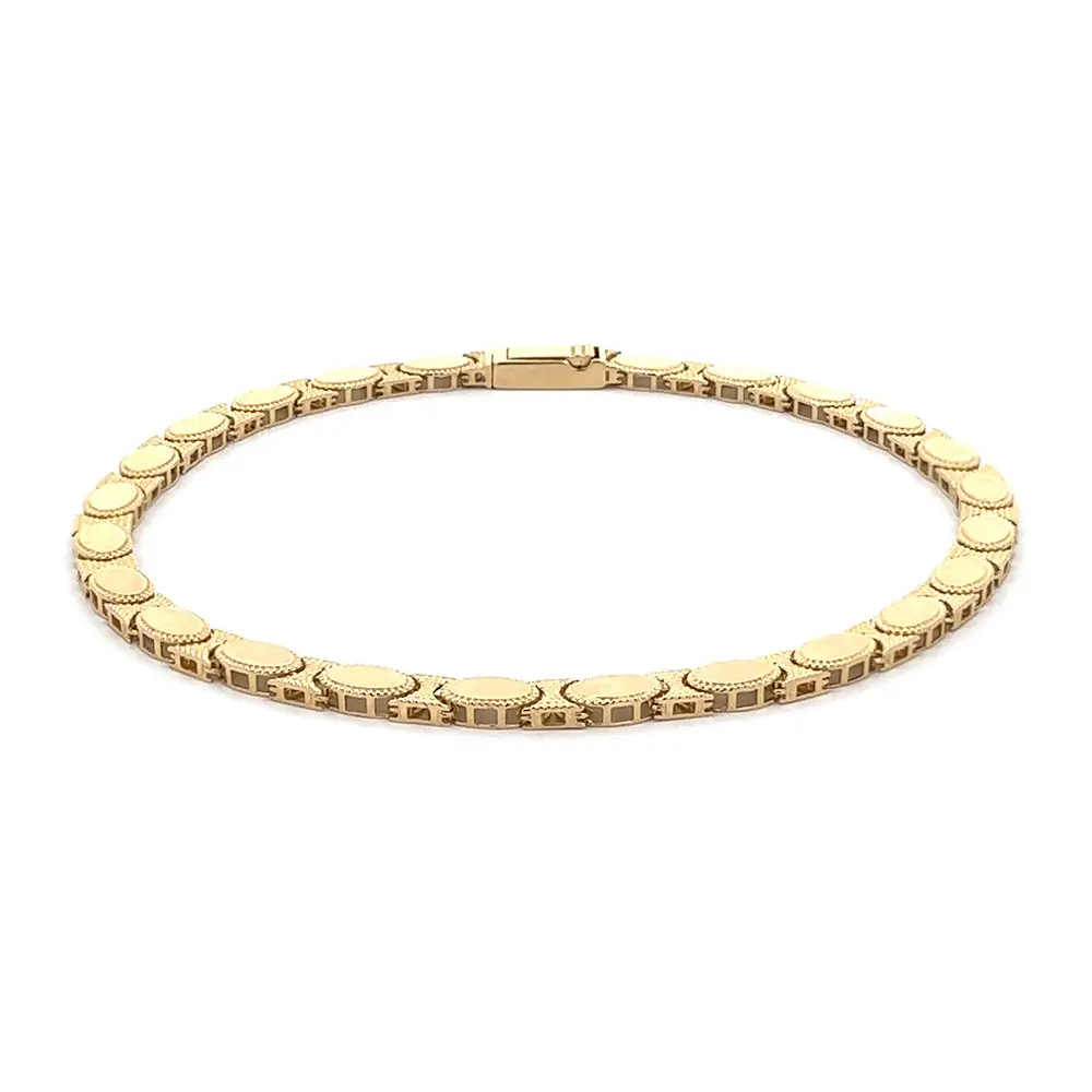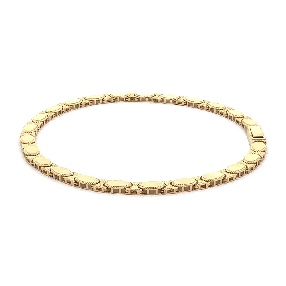 Das Goldarmband mit ovalen Gliedern verkörpert klassische Eleganz und feinste Handwerkskunst. Jedes Glied ist sanft oval geformt und mit einer feinen Textur verziert, die dem Schmuck Tiefe und Glanz verleiht.