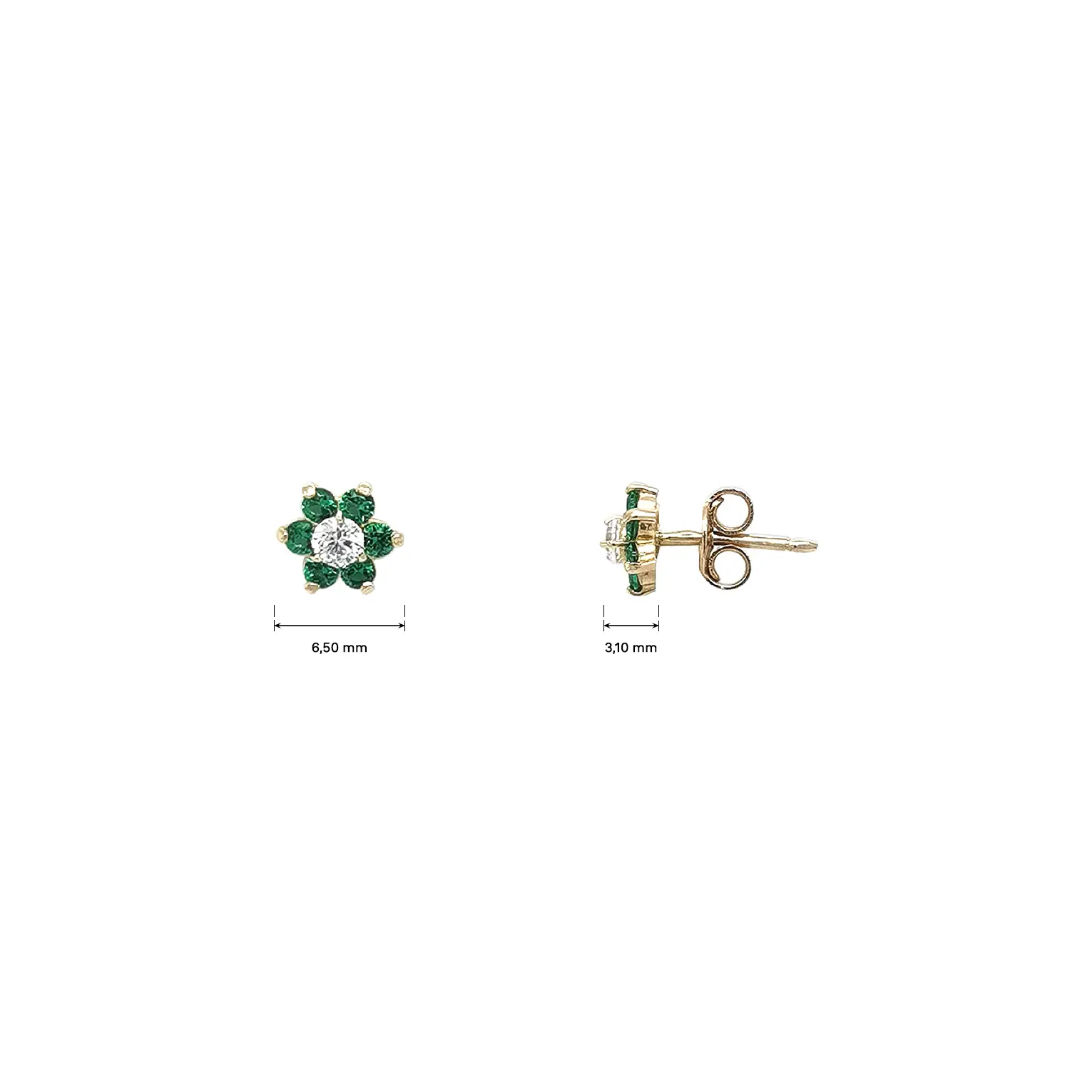 Goldene Blumen-Ohrstecker mit grünen und klaren Steinen