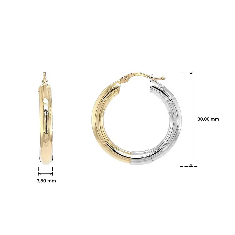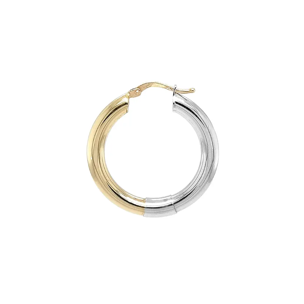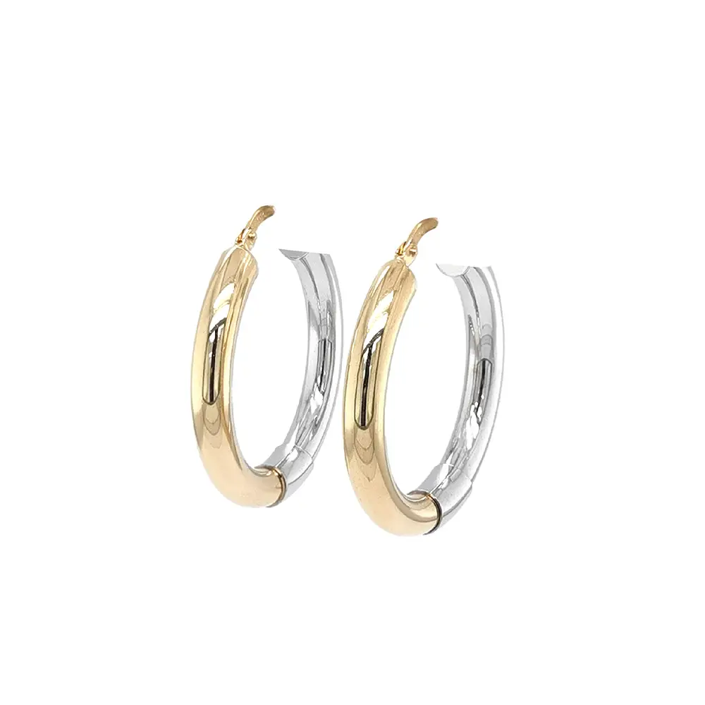 Goldene Creolen aus kombiniertem Gold überzeugen durch klare Linien und den eleganten Kontrast von Gelb- und Weißgold. Die hochglanzpolierte Oberfläche unterstreicht den luxuriösen Charakter und die präzise Verarbeitung.