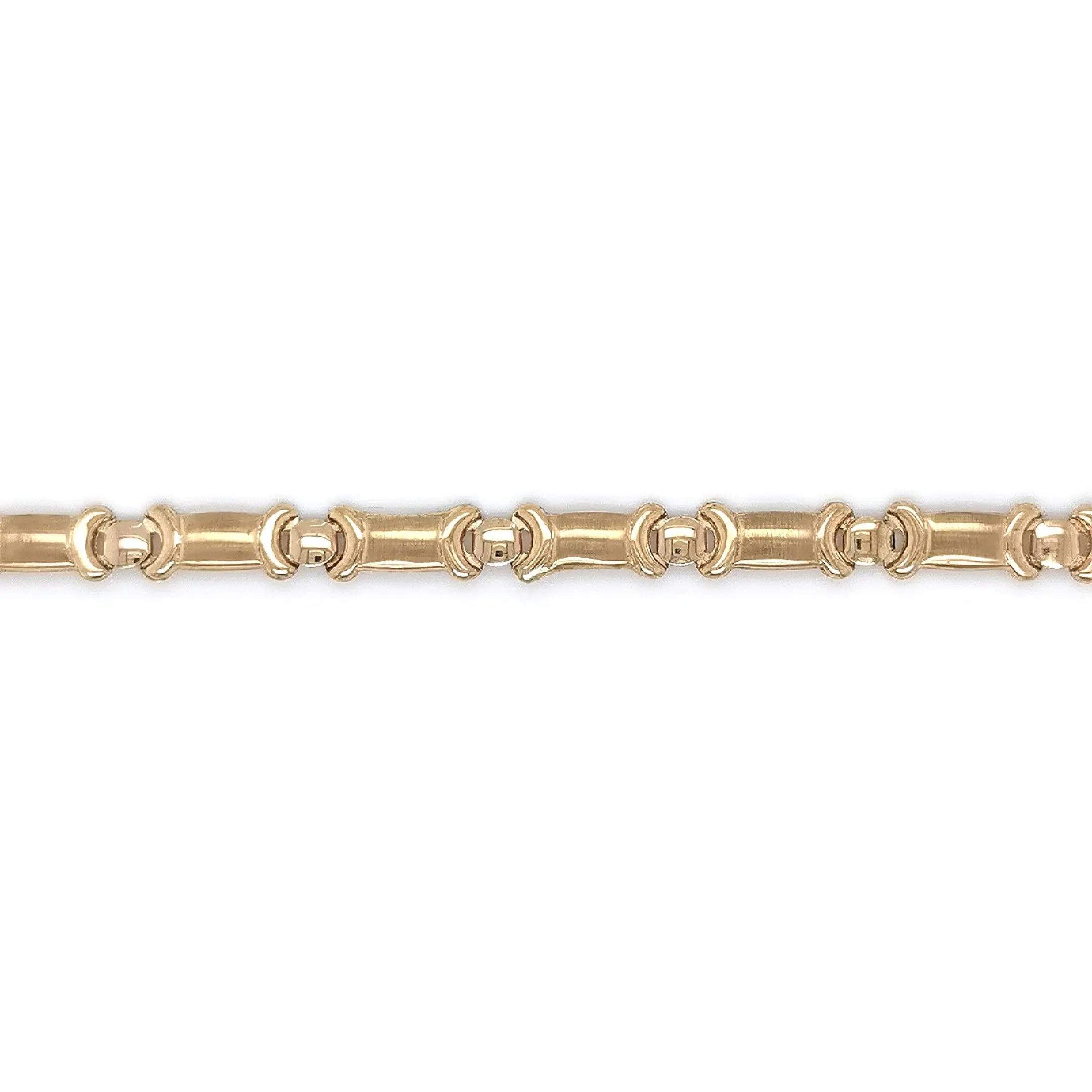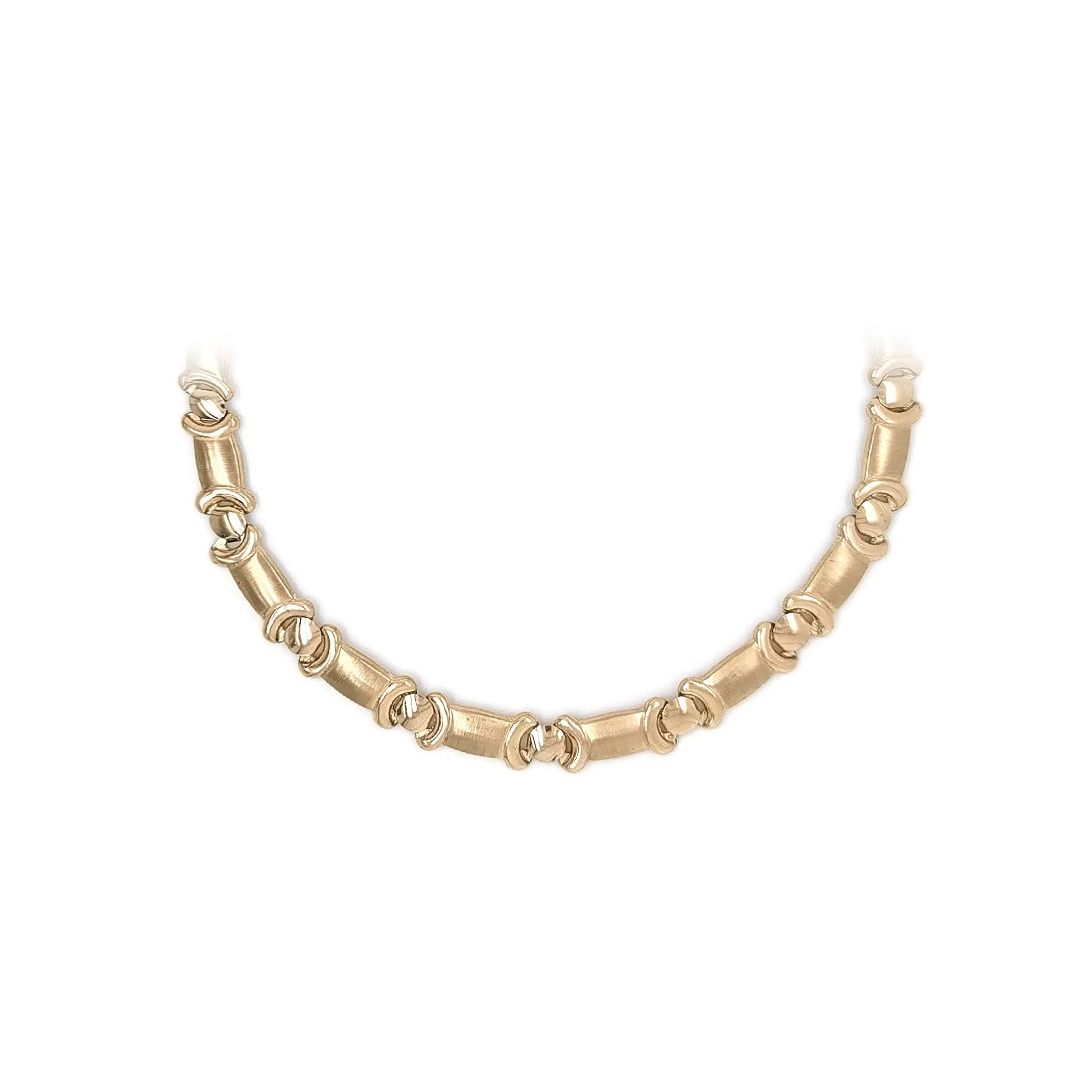 Goldene Gliederkette überzeugt durch eine moderne Interpretation der klassischen Kette mit einer Kombination aus polierten und matten Oberflächen. Satinierte zylindrische Glieder stehen im Kontrast zu glänzend polierten Verbindungselementen und verleihen der Kette Tiefe, Struktur und eine elegante Ausstrahlung.