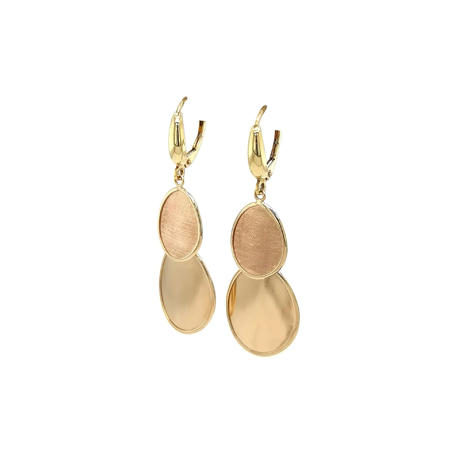 Diese goldenen Hängeohrringe beeindrucken durch die raffinierte Kombination zweier ovaler Elemente mit unterschiedlicher Oberflächenstruktur – ein sanft mattiertes oberes Oval und ein hochglanzpoliertes unteres. Das Zusammenspiel dieser Texturen sorgt für einen modernen, harmonischen Effekt und lässt den warmen Ton des Gelbgoldes bei jeder Bewegung erstrahlen.