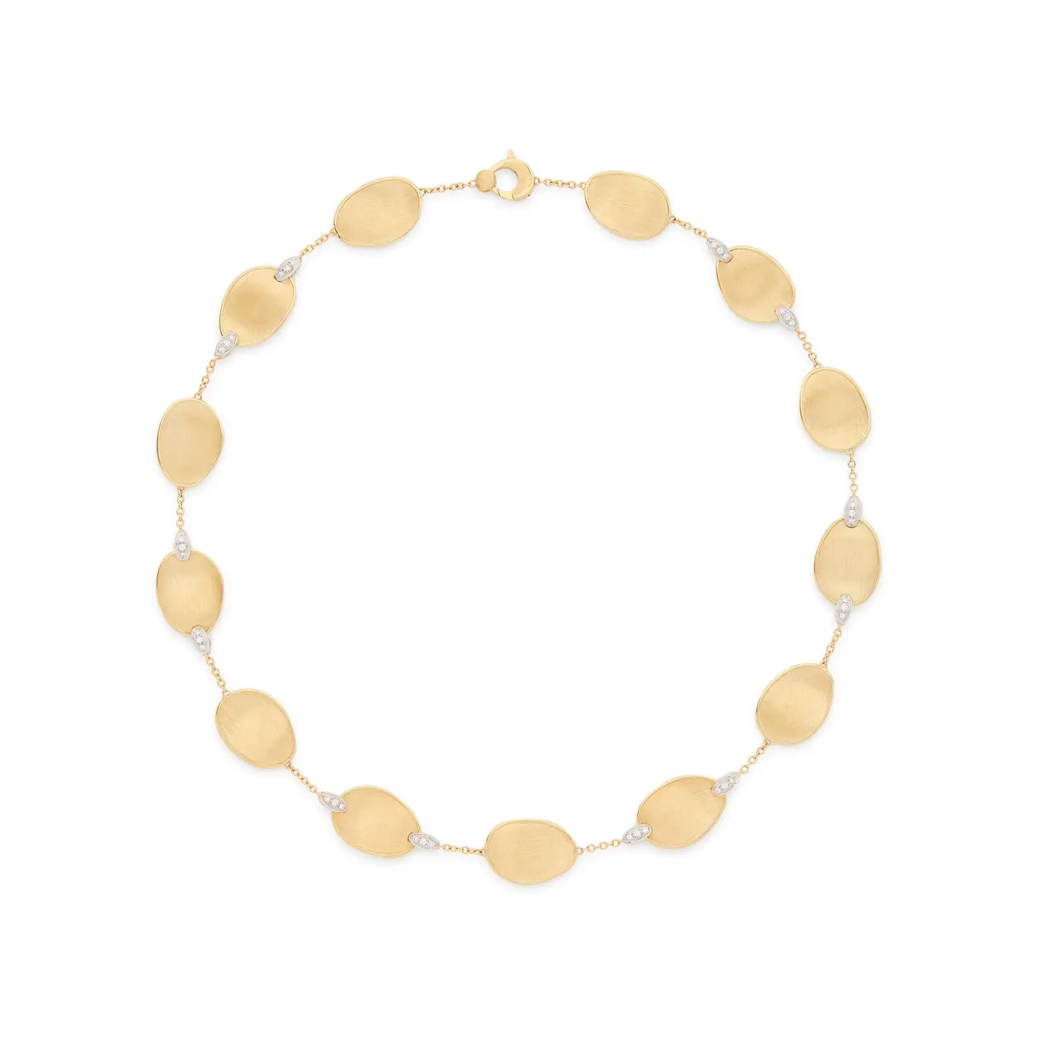 Die luxuriöse Goldhalskette Marco Bicego Lunaria Diamonds CB2099_B YW Q6 ist aus 18 Karat Gelbgold (750/1000) gefertigt und gehört zur ikonischen Lunaria Diamonds Kollektion, die von den natürlichen Formen von Blättern und organischen Linien inspiriert ist. Die Halskette kombiniert eine feine Goldkette mit handgeformten Goldblättern, deren Oberfläche mit der charakteristischen florentinischen Gravurtechnik (Bulino) verziert ist und eine satinierte Struktur erzeugt.