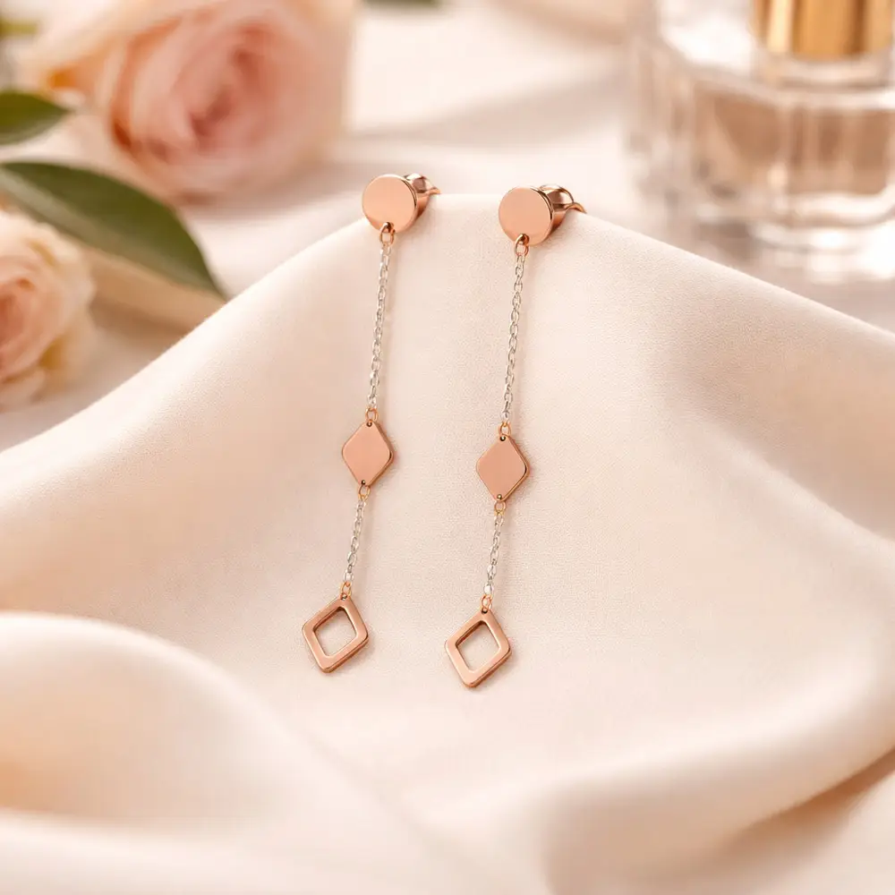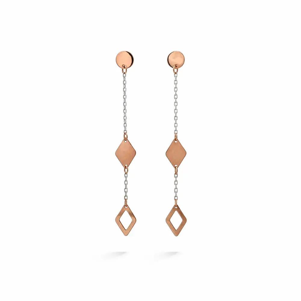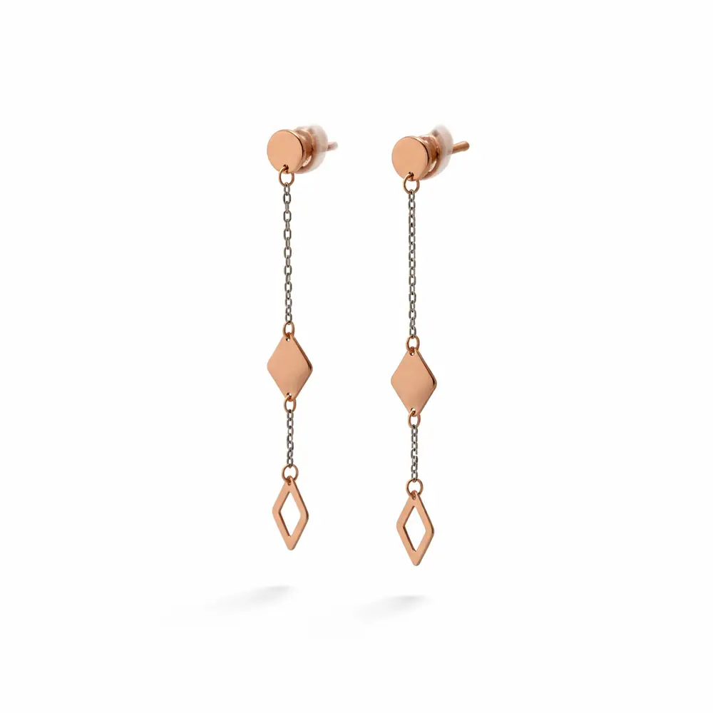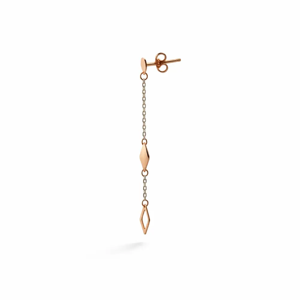 Goldene Kettenohrringe mit geometrischem Motiv überzeugen durch ihr klares, modernes Design, das eine feine Kette mit präzise geformten geometrischen Elementen verbindet. Die minimalistischen Linien schaffen eine elegante Komposition mit sanfter Bewegung und unterstreichen den zeitgemäßen Charakter des Schmucks.