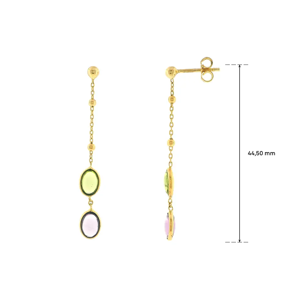 Die Ohrringe sind aus hochwertigem Gold gefertigt und mit sorgfältig eingesetzten, farbigen Steinen verziert, die das Licht wunderschön reflektieren. Dank präziser Verarbeitung und leichtem Design eignen sie sich sowohl für den Alltag als auch für besondere Anlässe. Länge der Ohrringe: 44,50 mm sorgt für eine elegante Bewegung und betont die Halslinie.