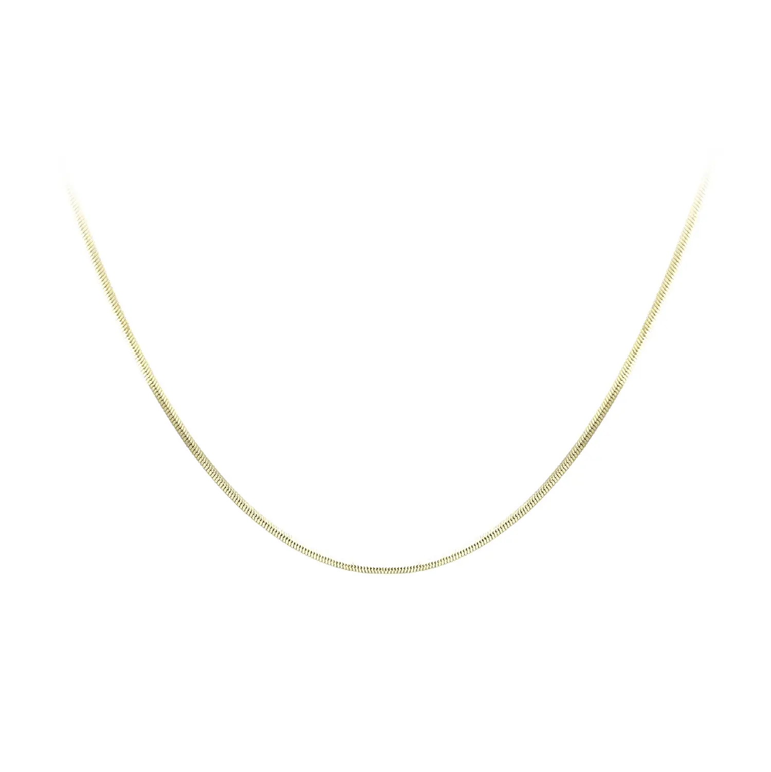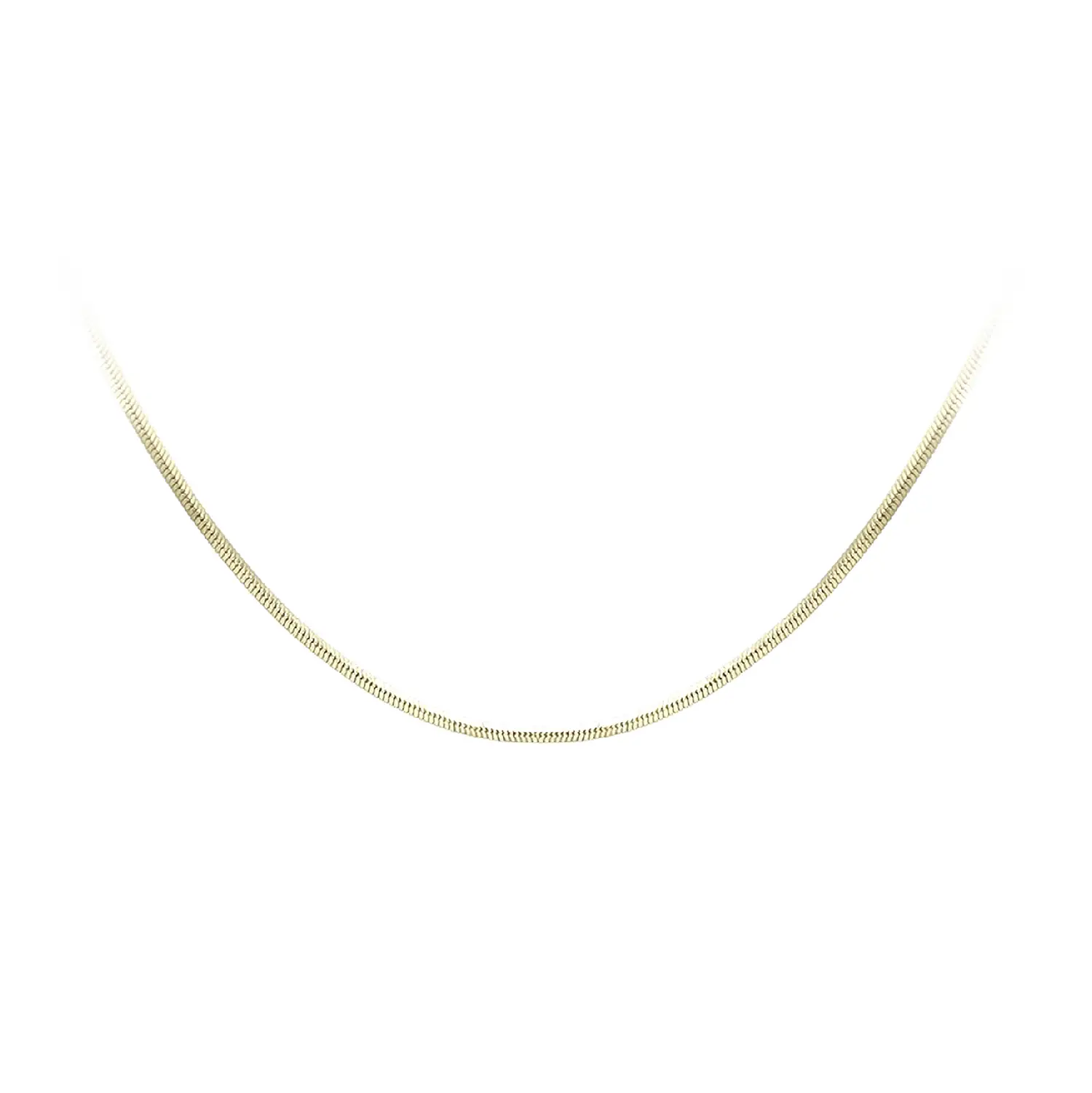 Diese elegante Goldkette im Schlangenmuster überzeugt durch ihre glatte, durchgehende Struktur und einen feinen Glanz, der sich harmonisch an den Hals anschmiegt. Das minimalistische Design wirkt klar und zeitlos und eignet sich ideal zum alleinigen Tragen oder mit einem zarten Anhänger.