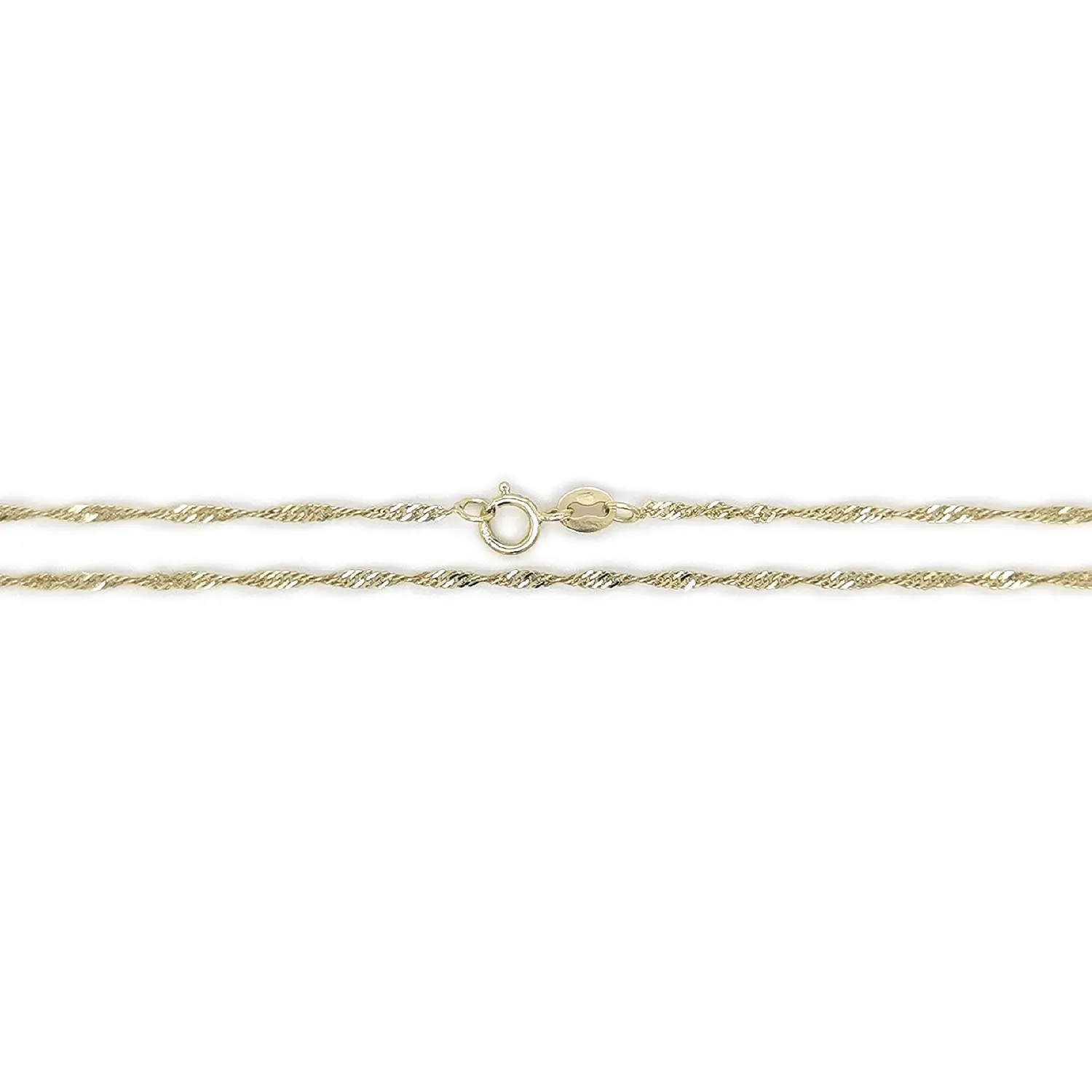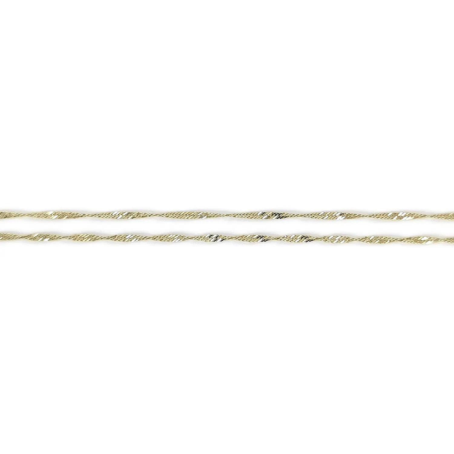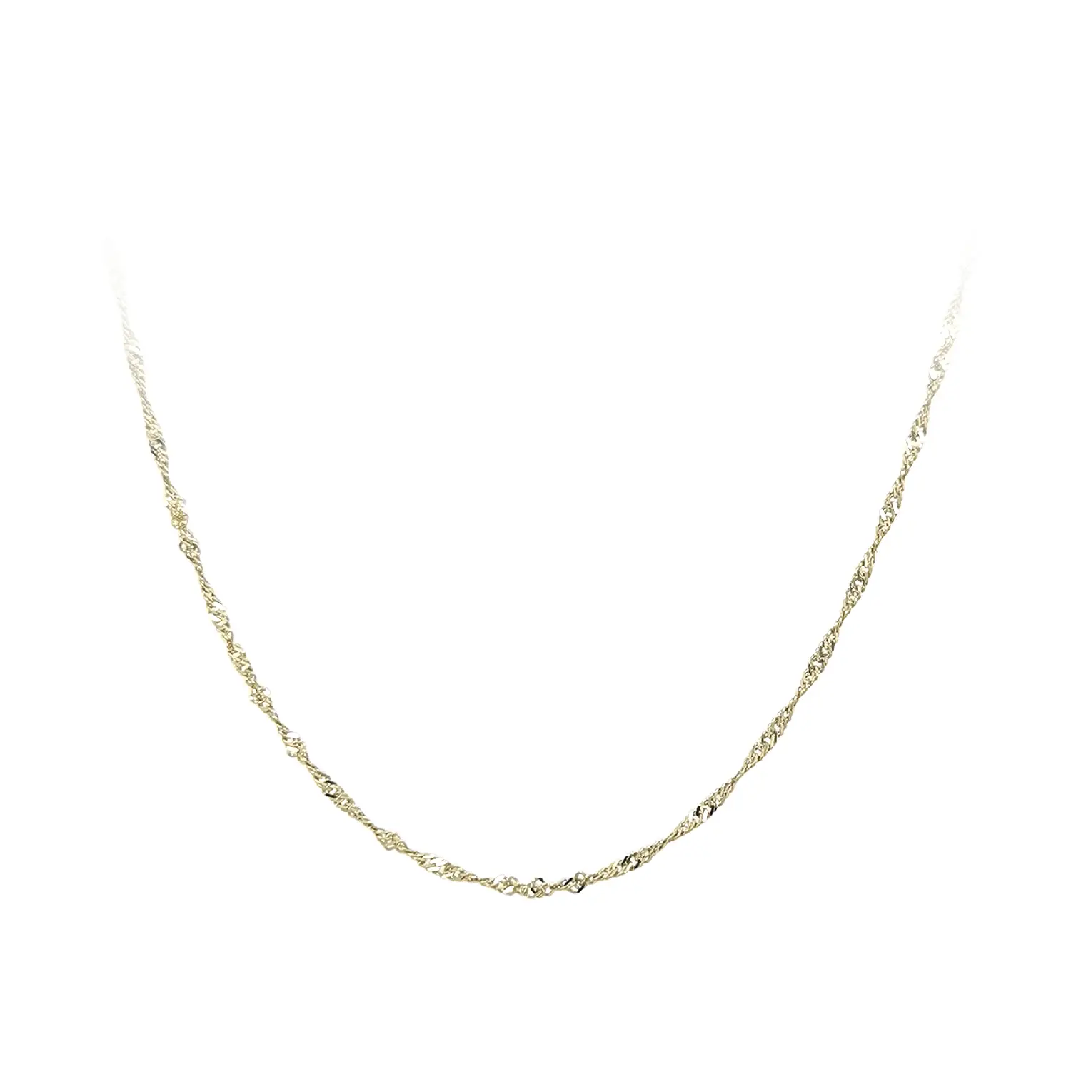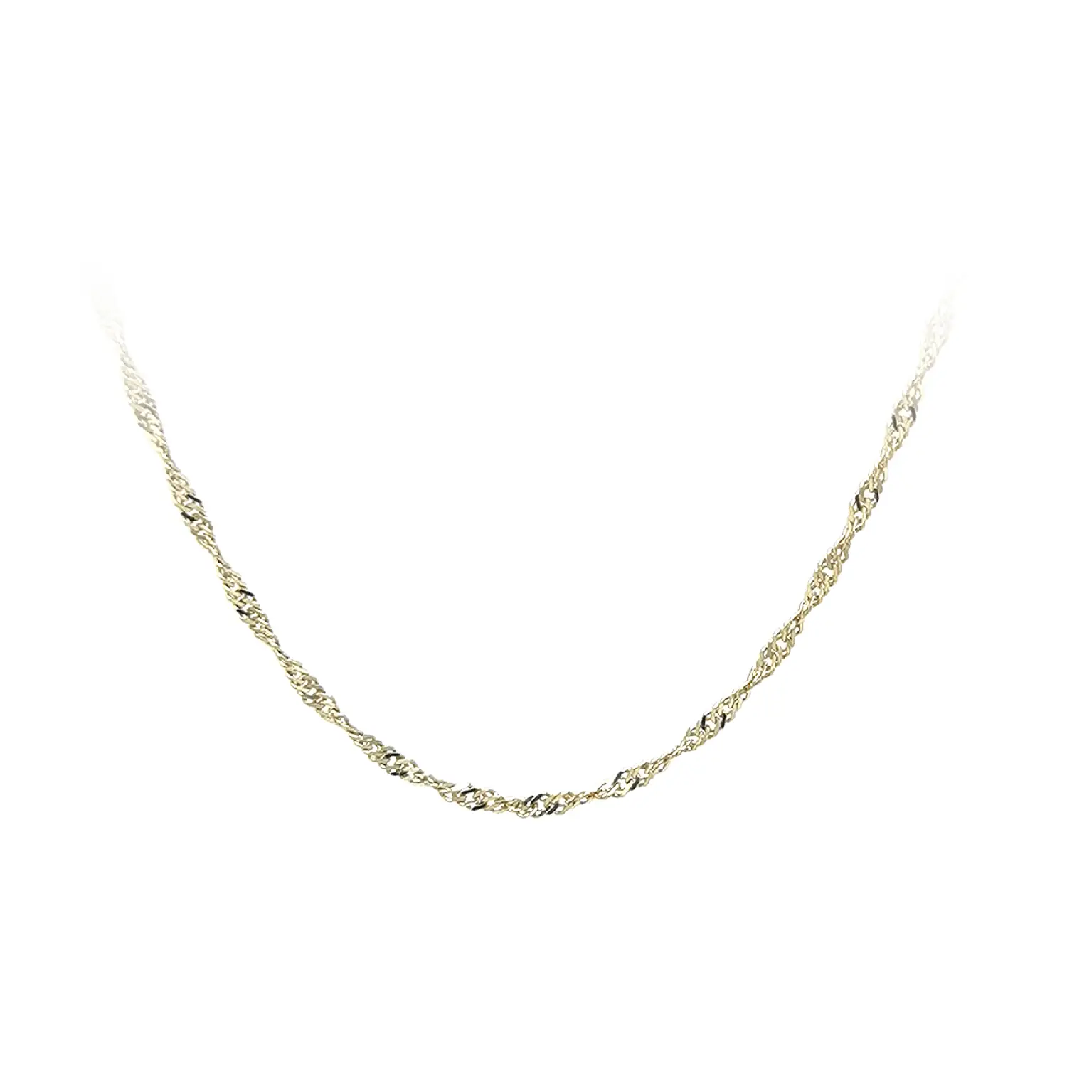 Die goldene Kette im Singapur-Muster besticht durch ihre fein gedrehte Struktur, die das Licht elegant reflektiert und für einen dezenten Glanz sorgt. Diese Ausführung hat eine Länge von 55 cm und eine Breite von 1,50 mm, wodurch sie etwas markanter wirkt und dennoch filigran bleibt.
