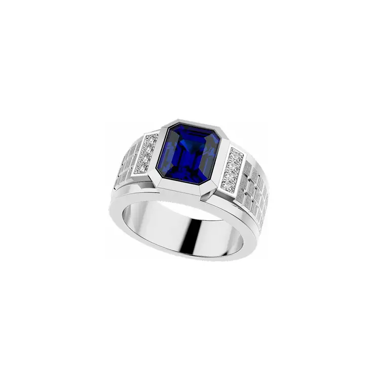 Im Zentrum steht der Hauptstein – Saphir (1 Stein) 4,49 ct, Smaragdschliff / Emerald, tiefblau (Herkunft: natürlich). Diamanten (8 Steine), runder Schliff / Round, weiß (Herkunft: natürlich), sorgen für Funkeln und Kontrast, betonen die Farbtiefe des Saphirs und die Architektur des Rings. Das Ergebnis ist ein zeitloser, markanter und eleganter Herrenring, der den persönlichen Stil seines Trägers klar zum Ausdruck bringt.
