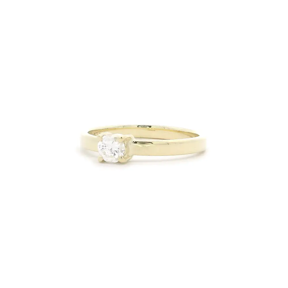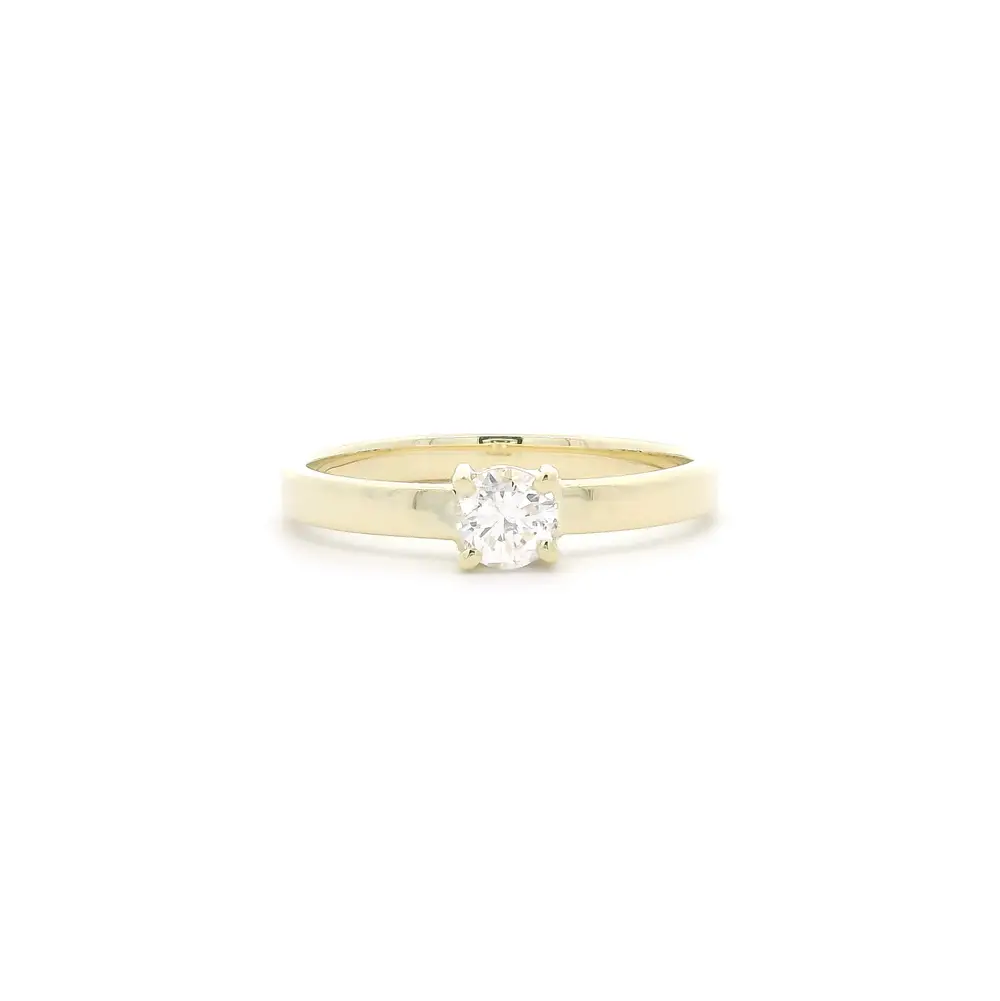 Dieser Verlobungsring aus 18kt Gelbgold verkörpert zeitlose Eleganz und die Symbolik der Liebe. Im Zentrum erstrahlt ein Solitaire-Diamant von 0,24 ct, dessen Brillantschliff die natürliche Schönheit und das Feuer des Steins hervorhebt.