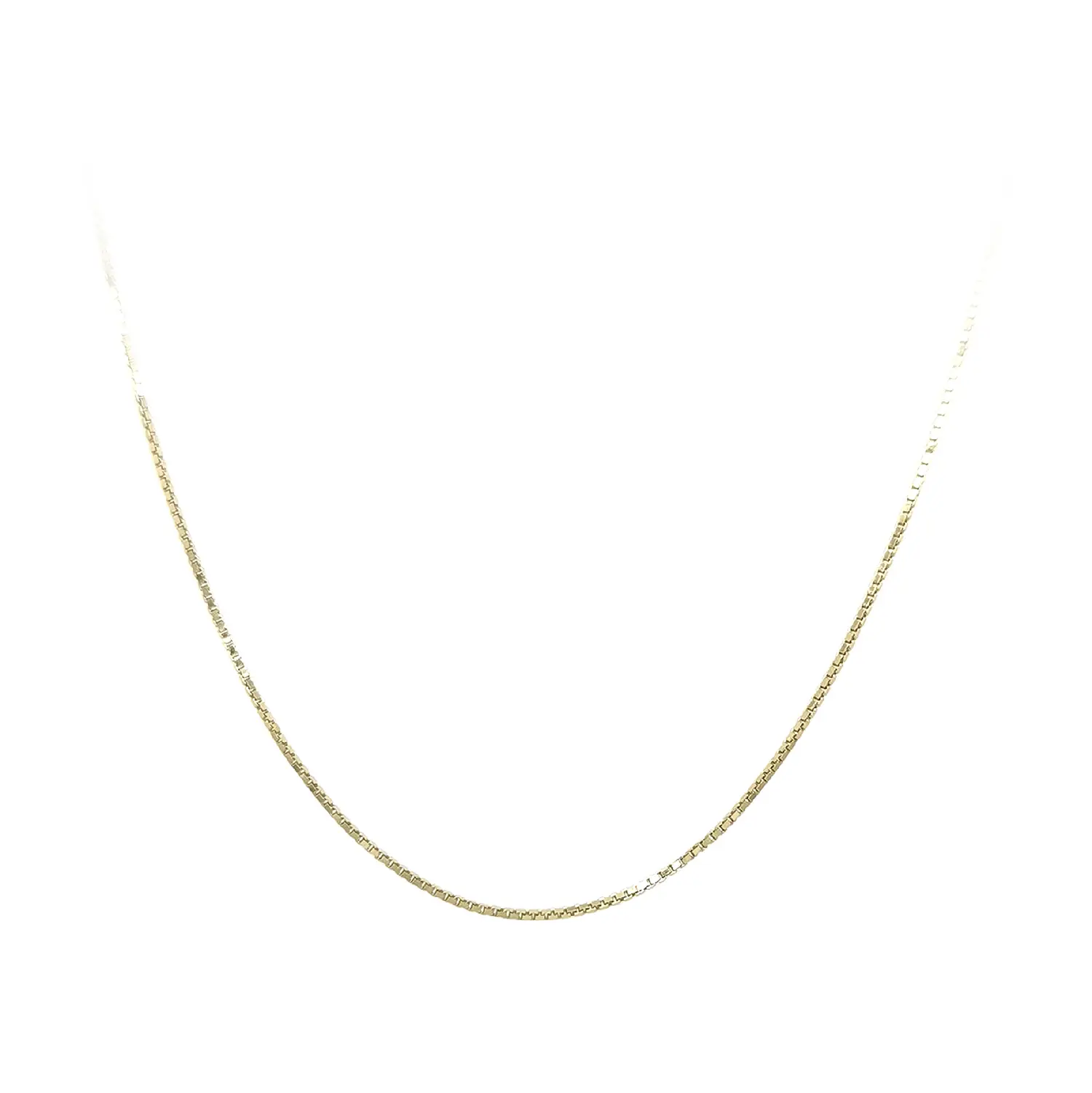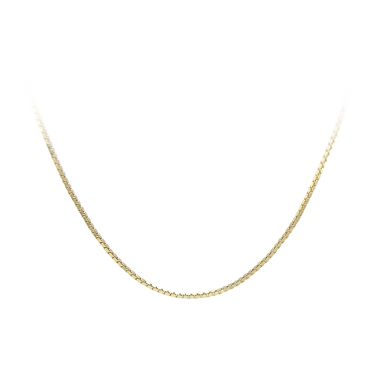 Die Box-Kette besticht durch ihre präzise Struktur kleiner quadratischer Glieder, die eine glatte, kompakte Linie mit feinem, elegantem Glanz bilden. Ihr minimalistischer Charakter verleiht ihr eine klare, zeitlose Ausstrahlung und macht sie sowohl für den Alltag als auch für elegante Anlässe ideal.