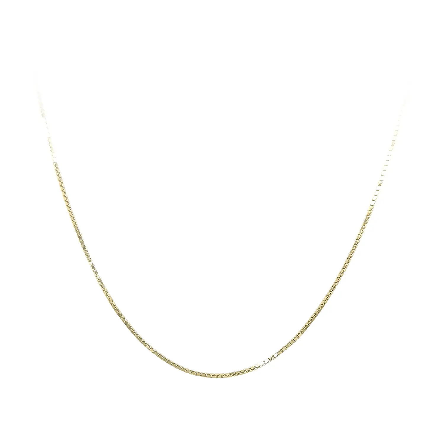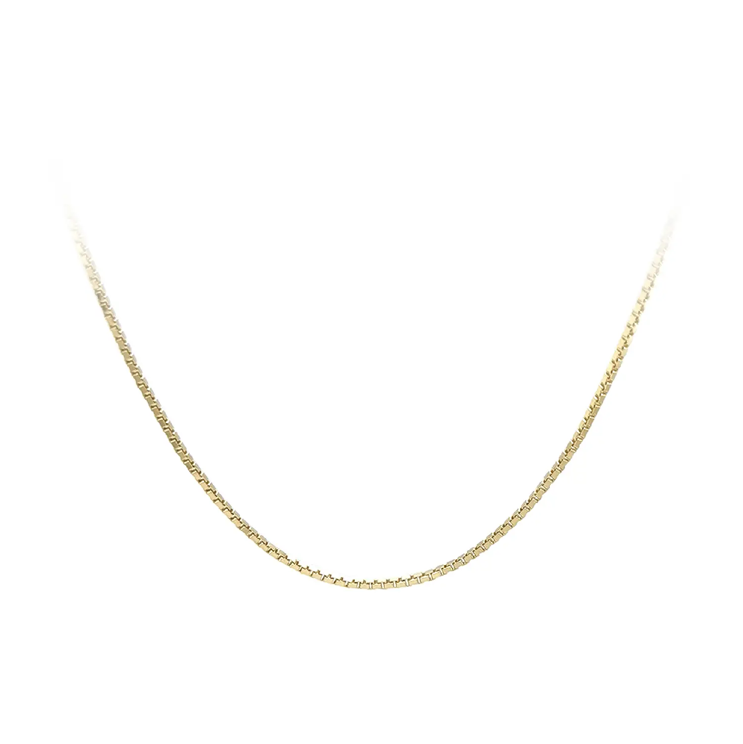 Die goldene Box-Kette besticht durch ihre präzise Struktur kleiner quadratischer Glieder, die eine glatte, elegant geometrische Linie mit feinem Glanz bilden. Ihr minimalistisches Design wirkt zeitlos und passt sowohl zum täglichen Tragen als auch zu Kombinationen mit anderem Schmuck. Die Breite von 0,80 mm verleiht ihr einen zarten, raffinierten Charakter.