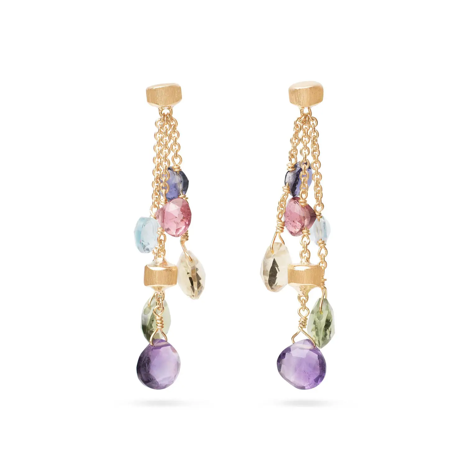Die Ohrringe verfügen über ein dreireihiges Hängedesign, bei dem facettierte natürliche Edelsteine auf feine Golddrähte aufgezogen sind. Zwischen den Edelsteinen befinden sich kleine handgravierte Goldperlen, die mit der traditionellen florentinischen Bulino-Technik verziert sind und dem Gold eine satinierte Oberfläche verleihen.