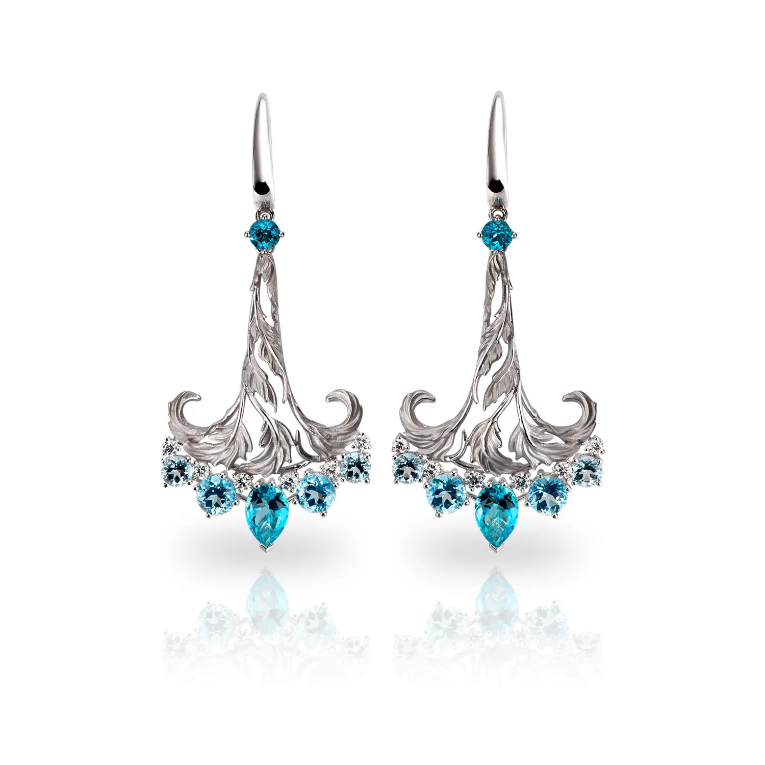 Im Mittelpunkt stehen 12 blaue Topase, insgesamt 4,30 ct, je im Birnentyp (Pear Cut) von 6,90 × 3,85 mm — ihr kühles Blau verleiht dem Schmuck moderne Eleganz. Ergänzt werden sie durch 6 weiße Diamanten, mit einem Gesamtgewicht von 0,34 ct, jeweils rund geschliffen (Round), 1,60 mm groß, Farbe H, Reinheit VS, die dem Design feinen Glanz verleihen.