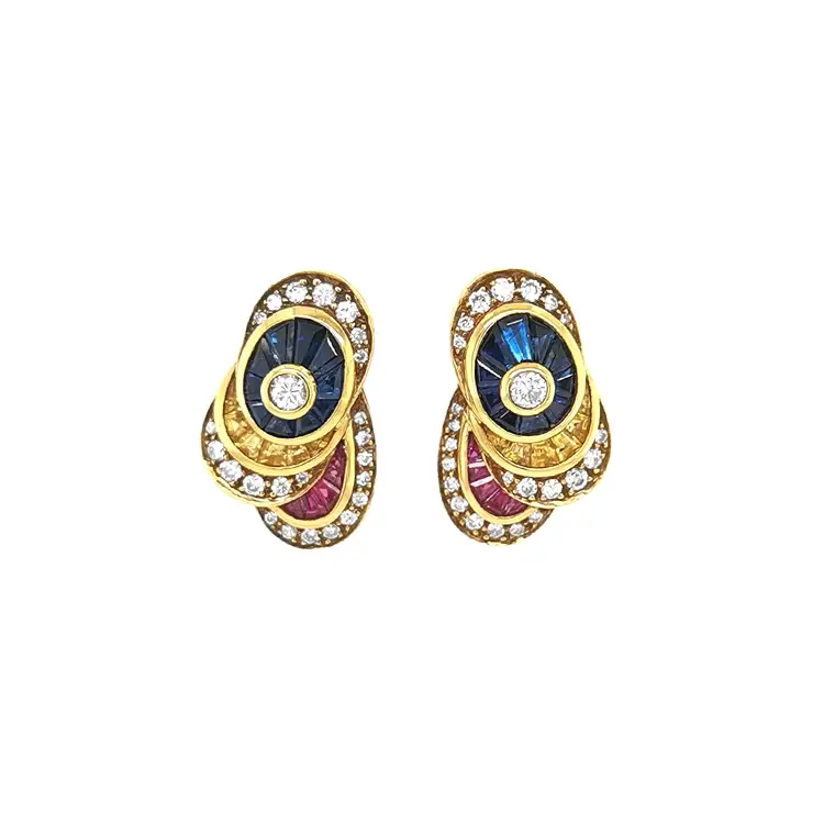 Goldohrringe mit Rubinen, blauen und gelben Saphiren und Diamanten