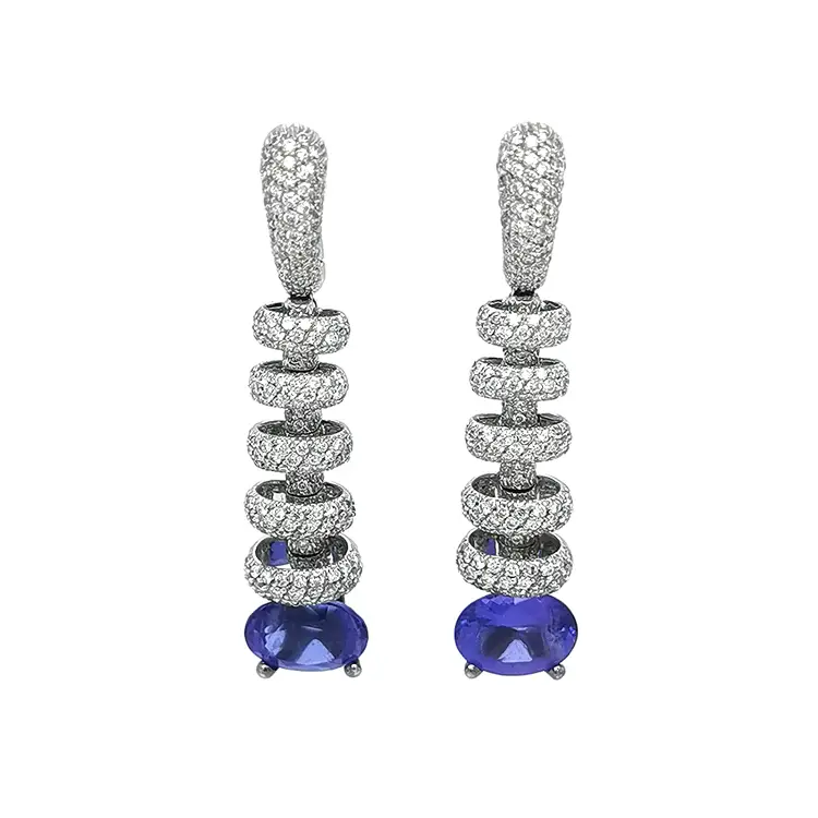 Im Mittelpunkt stehen zwei natürliche Tansanit-Steine mit einem Gesamtgewicht von 5,74 ct, oval geschnitten (8,65 × 6,45 mm), deren tiefblaue Farbe Eleganz und Ruhe ausstrahlt. Ergänzt werden sie durch 234 natürliche weiße Diamanten mit einem Gesamtgewicht von 2,47 ct, rund geschliffen, 1,20 mm, Farbe G, Reinheit VS — gemeinsam bilden sie einen leuchtenden Rahmen, der die Tansanite wirkungsvoll hervorhebt.