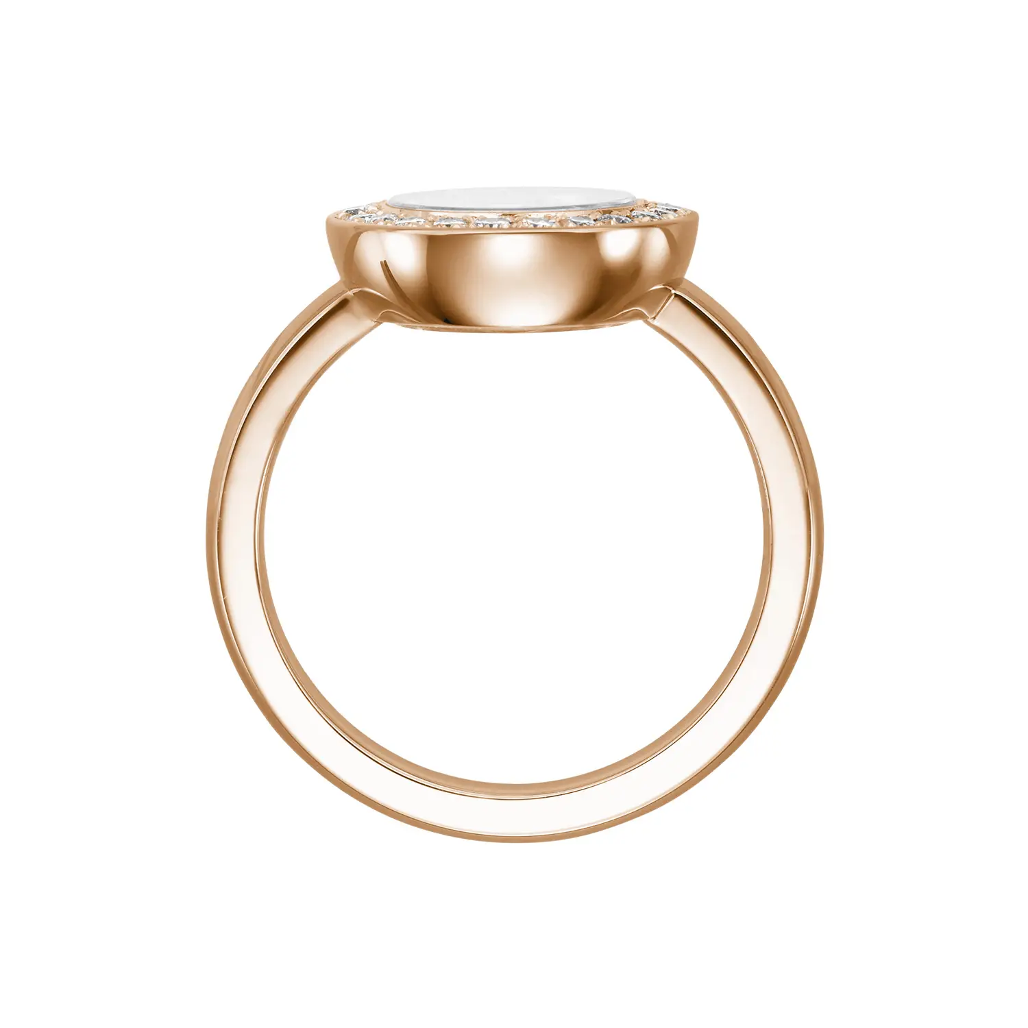 Der Chopard Happy Diamonds Icons Ring 82A611-5211 aus 18 K Roségold vereint verspielten Luxus und zarte Eleganz. Im Zentrum des Rings bewegen sich zwischen zwei Saphirgläsern drei frei schwebende Diamanten, die bei jeder Bewegung funkelnde Lichtreflexe erzeugen. Das ikonische Happy Diamonds Design steht für Freiheit, Licht und feminine Anmut und verleiht dem Schmuckstück einen lebendigen und unverwechselbaren Charakter.