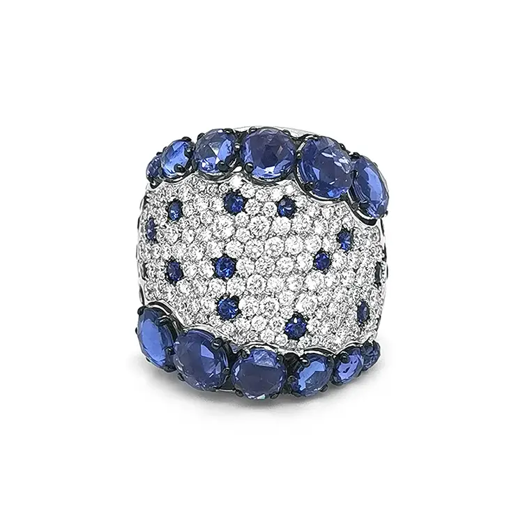 Die dominante Zier bildet ein Ensemble aus 44 natürlichen blauen Saphiren gesamt 5,62 ct im runden Rosenschliff, Größen 1,80–6,40 mm, ergänzt um einen weiteren natürlichen runden Saphir mit 1,28 ct. Ihre satte Farbe wird durch ein Pavé aus natürlichen weißen Diamanten von 1,98 ct, Rundschliff, Reinheit SI, Farbe G, harmonisch ausbalanciert. Die Verbindung von Saphiren und Diamanten verleiht Dynamik und Brillanz und macht den Ring zum Symbol von Luxus, Originalität und außergewöhnlichem Stil.
