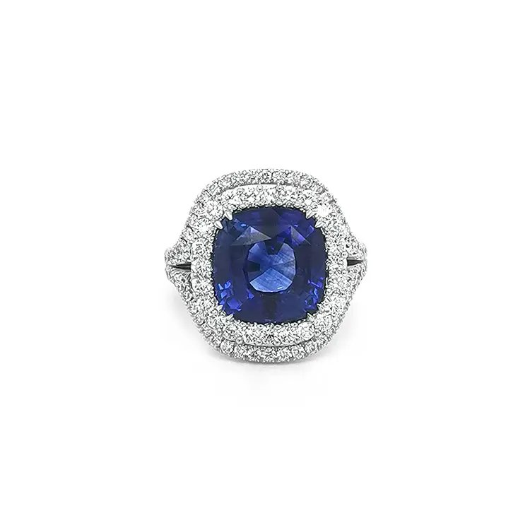 Im Zentrum sitzt ein natürlicher Saphir, 7,67 ct (1 Stk.), im Kissenschliff (11,35 × 11,05 mm), sattblau. Für Funkeln und Kontrast sorgt ein Pavé aus natürlichen Diamanten, 1,29 ct (88 Stk.), Rundschliff (1,70–2,30 mm), weiß, Reinheit SI, Farbe G. Die präzise Fassung hebt sowohl die Tiefe des Saphirs als auch die Brillanz der Diamanten hervor – ein luxuriöser, ausdrucksstarker und zeitloser Ring, der zum Highlight Ihrer Schmucksammlung wird.