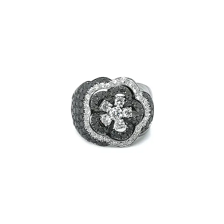 Für Glanz sorgen natürliche schwarze Diamanten, 1,66 ct (75 Stk.), im Rundschliff, Ø 1,80 mm, die das florale Motiv rahmen und formen. Kontrast und Brillanz verleiht ein Halo aus natürlichen weißen Diamanten, 1,02 ct (31 Stk.), Rundschliff (Ø 1,55–2,30 mm), Reinheit SI, Farbe G. Präzise Fassung und der Dialog von dunklen und hellen Steinen ergeben einen luxuriösen, zeitlosen und wahrhaft unübersehbaren Ring.