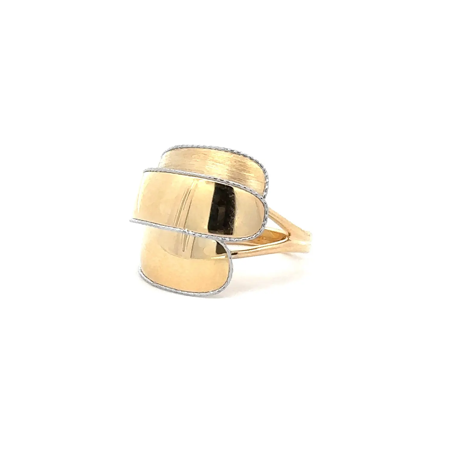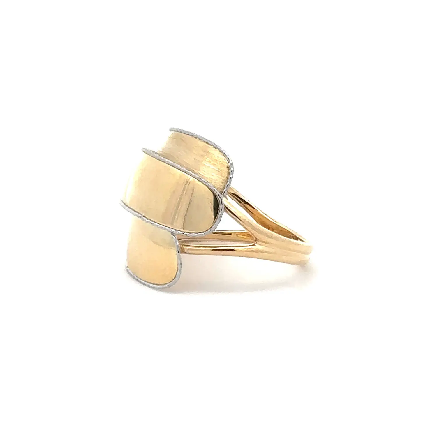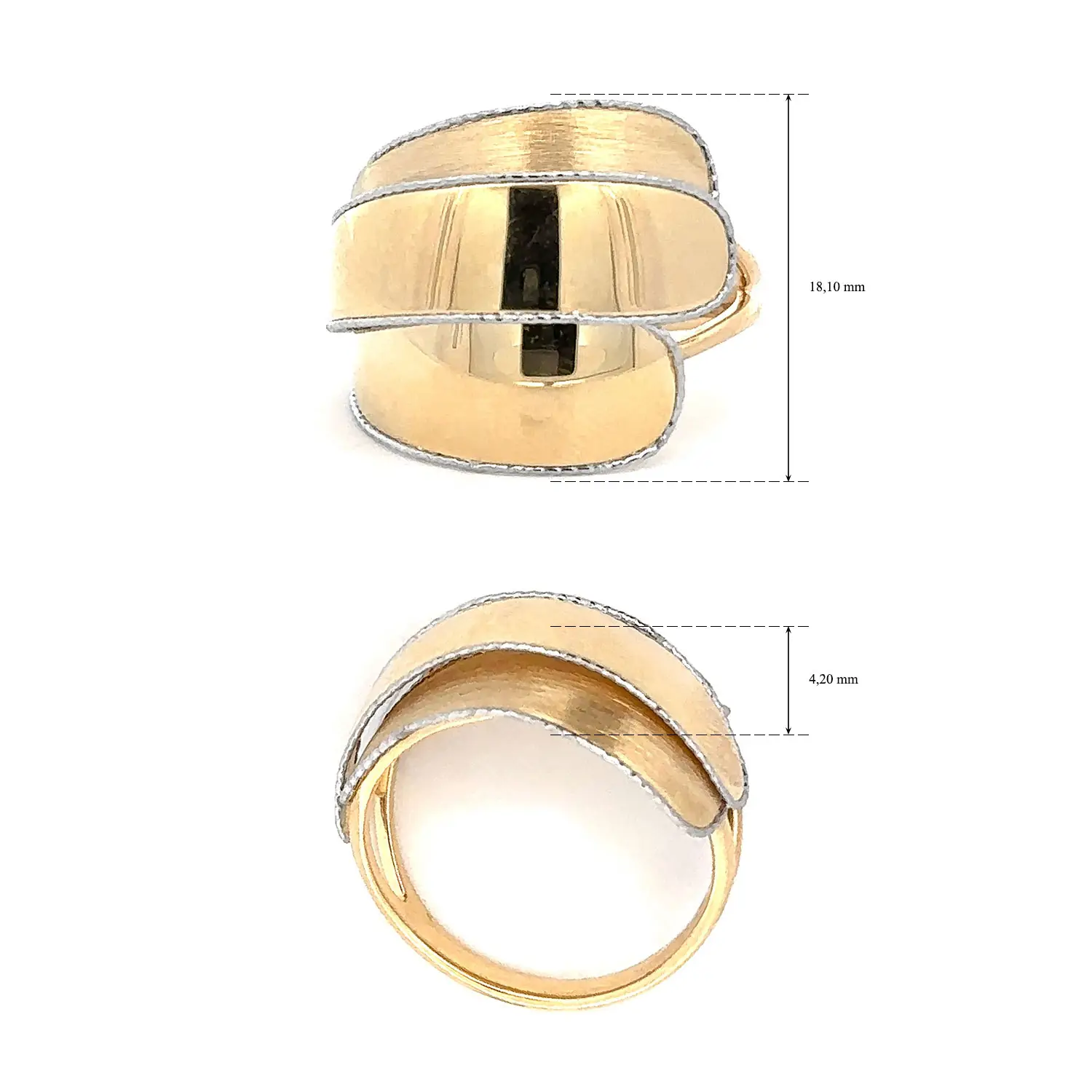 Dieser Ring besticht durch seine plastische Form mit überlappenden Linien, gefertigt aus einer Kombination aus Gelb- und Weißgold. Der feine Kontrast der Oberflächenveredelungen verleiht dem Schmuckstück einen modernen und eleganten Charakter, der außergewöhnlich und gleichzeitig harmonisch wirkt. Die organischen Kurven schaffen eine besondere Dynamik und unterstreichen die künstlerische Ausstrahlung des Designs.
