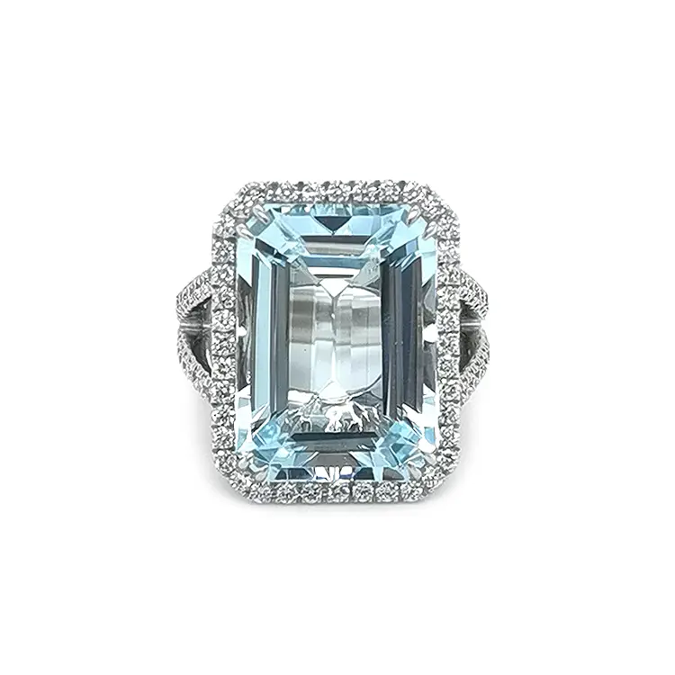 Im Zentrum steht ein natürlicher Aquamarin, 14,22 ct (1 Stk.), Smaragdschliff (18,80 × 12,85 mm), klares Blau. Funkeln und Kontrast liefert ein Pavé aus natürlichen Diamanten, 0,95 ct (80 Stk.), Rundschliff (Ø 1,20 mm), weiß, Reinheit SI, Farbe G. Die präzise Fassung betont die Tiefe des Aquamarins und die Brillanz der Diamanten—ein luxuriöser, zeitloser und wahrhaft markanter Ring für besondere Anlässe.