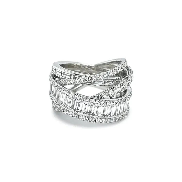 Die Komposition wird von natürlichen Diamanten 2,27 ct (30 Stk.) im Baguetteschliff (3,20 × 2,10 mm, weiß, Reinheit VS, Farbe G) dominiert. Ihr Funkeln verstärkt ein Pavé aus natürlichen Diamanten 1,69 ct (78 Stk.) im Rund-/Brillantschliff (Ø 1,35–2,20 mm), weiß, Reinheit SI, Farbe G. Die präzise Fassung betont den Formenkontrast und maximale Brillanz – Ergebnis ist ein luxuriöser, zeitloser und wahrhaft markanter Ring.