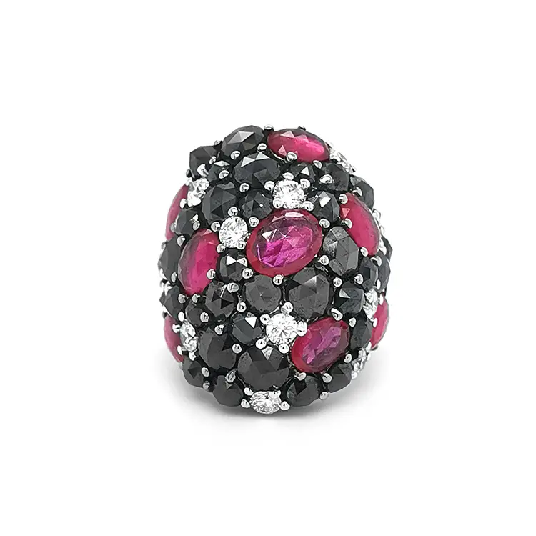 Goldring mit Rubinen, schwarzen und weißen Diamanten