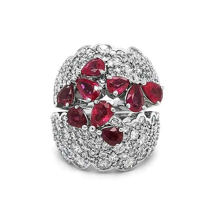 Das Zentrum bilden 9 natürliche Rubine mit einem Gesamtgewicht von 3,35 ct (5,80 × 4,40 mm), deren tiefrote Farbe Leidenschaft und Stärke symbolisiert. Umgeben werden sie von 160 natürlichen weißen Diamanten mit einem Gesamtgewicht von 4,54 ct (1,90 mm, Farbe G–H, Reinheit VS), die das Feuer der Rubine durch ihren brillanten Glanz verstärken.
