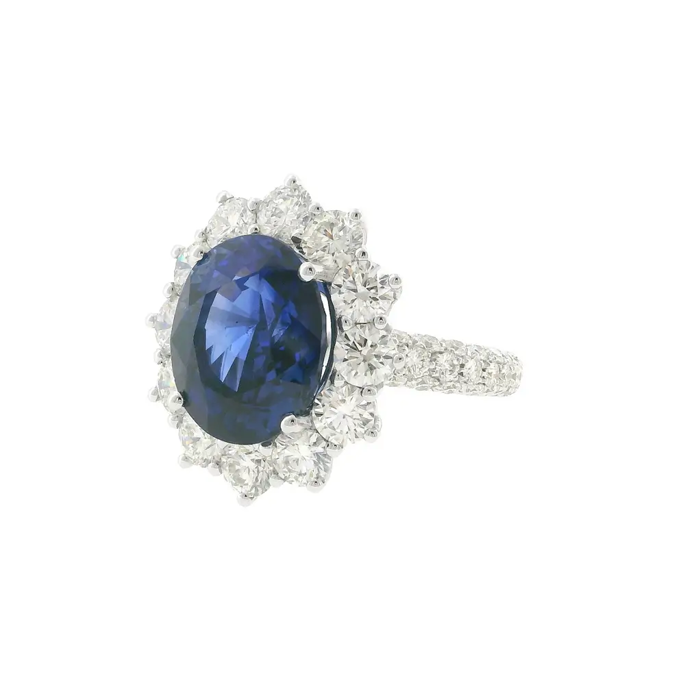 Im Mittelpunkt steht ein natürlicher Saphir mit einem Gewicht von 8,39 ct, dessen tiefblauer Farbton und ovaler Schliff (12,45 × 10,40 mm) pure Schönheit verkörpern. Umrahmt wird er von 44 natürlichen Diamanten mit einer Gesamtkaratzahl von 2,98 ct (2,00–3,80 mm, Farbe G, Reinheit VS), die ein funkelndes Lichtspiel erzeugen.