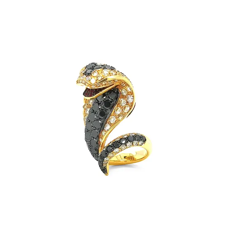 Das Zentrum bilden 48 natürliche schwarze Diamanten mit einem Gesamtgewicht von 8,40 ct (3,50–3,80 mm), deren dunkles Leuchten geheimnisvoll wirkt. Ergänzt werden sie durch 75 weiße Diamanten mit 4,90 ct (1,80–2,50 mm), die einen atemberaubenden Kontrast erzeugen. Abgerundet wird das Design durch fünf natürliche Rubine mit 0,26 ct, die dem Ring einen Hauch von Leidenschaft verleihen.