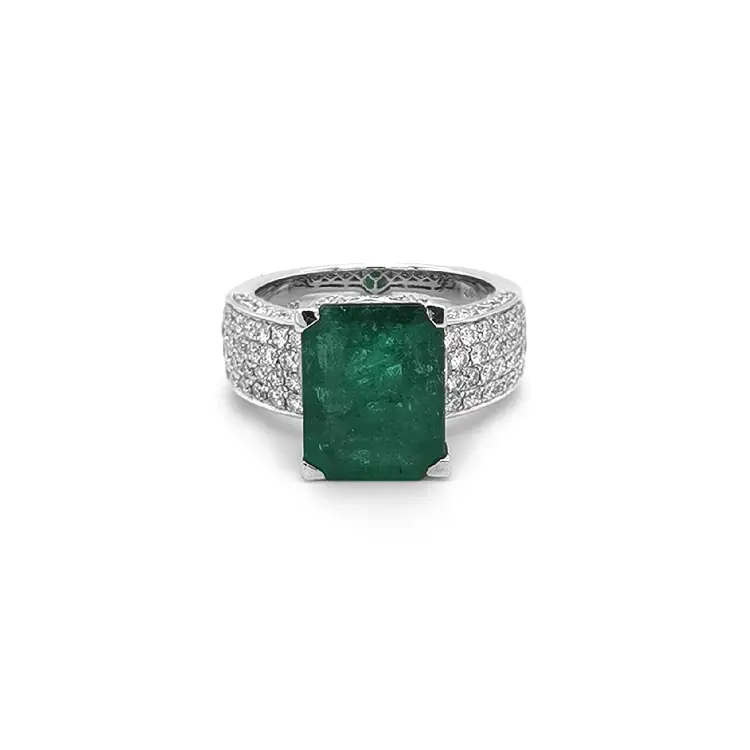 Dieser elegante Smaragd- und Diamantring von BENY Jewellery ist die perfekte Wahl für Frauen, die Luxus, Qualität und Stil schätzen. Gefertigt aus 18 kt (750/1000) Weißgold mit hochglanzpolierter Oberfläche, begeistert er durch seinen intensiven Grünton und seinen luxuriösen Glanz. Im Mittelpunkt steht ein natürlicher Smaragd mit einem Gewicht von 4,40 ct, im Emerald-Schliff (12,35 × 9,5 mm) – ein Symbol für Harmonie und Eleganz.