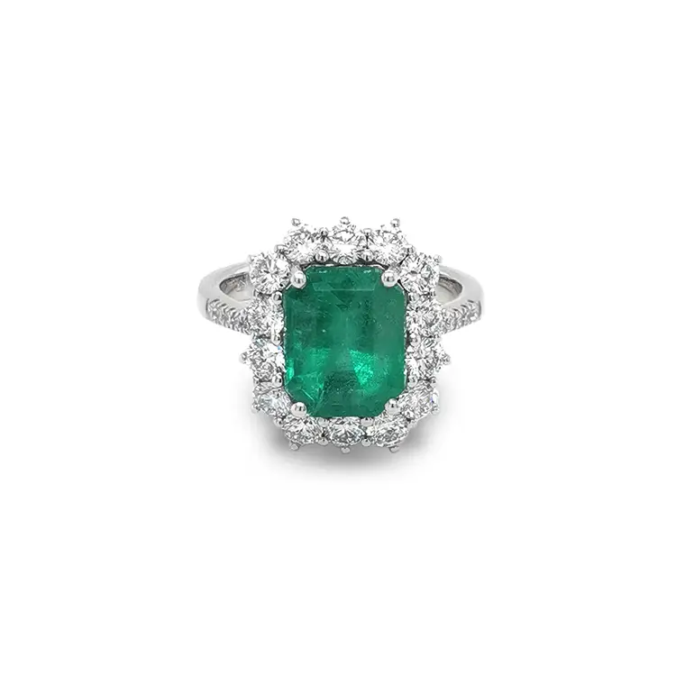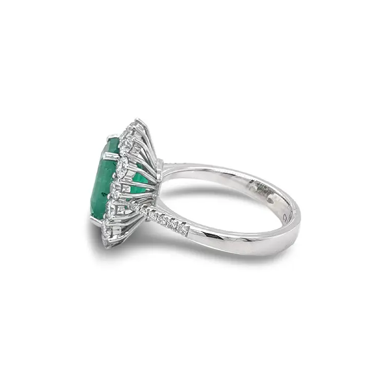 Im Mittelpunkt steht ein natürlicher Smaragd mit 3,34 ct, den Maßen 9,76 × 7,87 × 6,44 mm und einem edlen Emerald-Schliff, der die Tiefe und Leuchtkraft des grünen Farbtons perfekt betont.