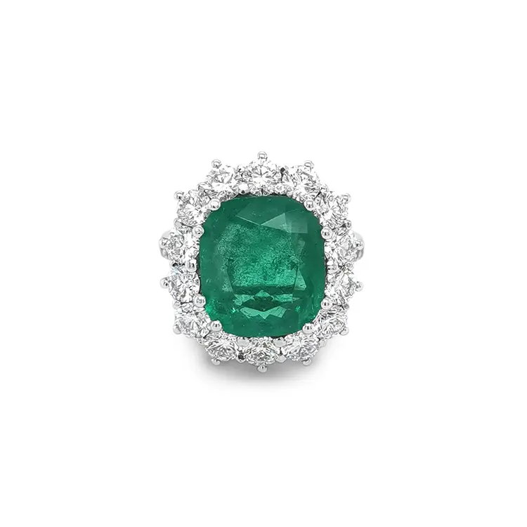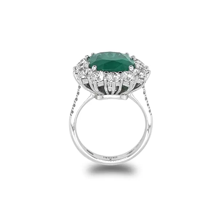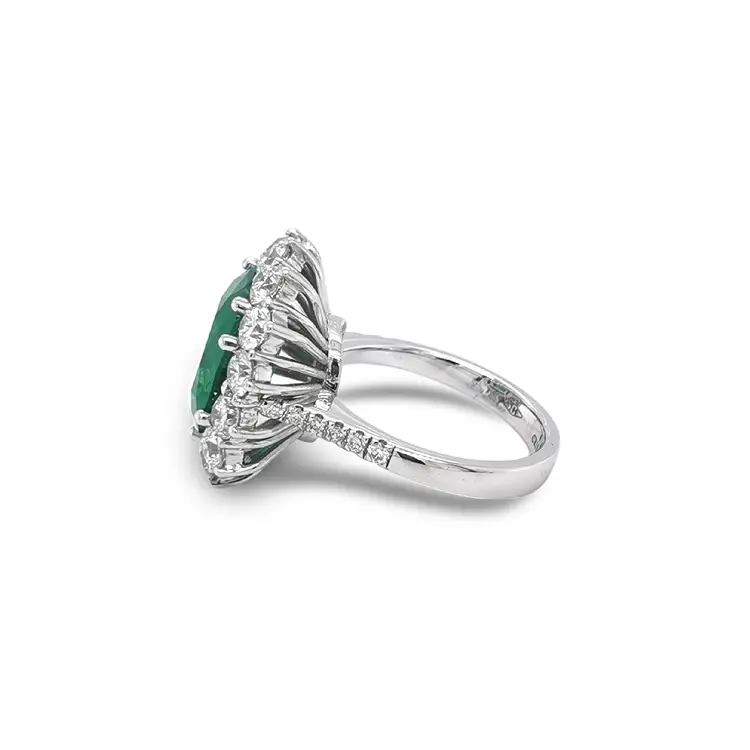 Im Mittelpunkt steht ein natürlicher Smaragd von außergewöhnlicher Qualität, 5,18 ct, 12,51 × 11,04 × 5,45 mm, in einem eleganten ovalen Schliff (Oval). Sein tiefes, sattes Grün erinnert an die üppigen Landschaften Kolumbiens, der Heimat dieses kostbaren Edelsteins.