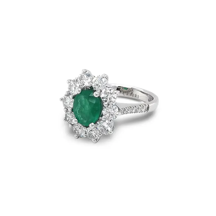 Dieser Smaragd- und Diamantring von Crieri vereint natürliche Schönheit mit italienischer Handwerkskunst. Im Mittelpunkt steht ein natürlicher Smaragd von 1,44 ct, mit den Maßen 8,20 × 6,90 × 4,07 mm, in einem edlen ovalen Schliff (Oval) und intensiver grüner Farbe.