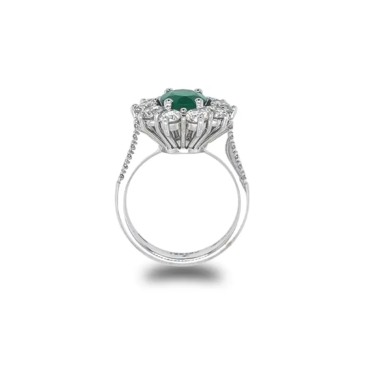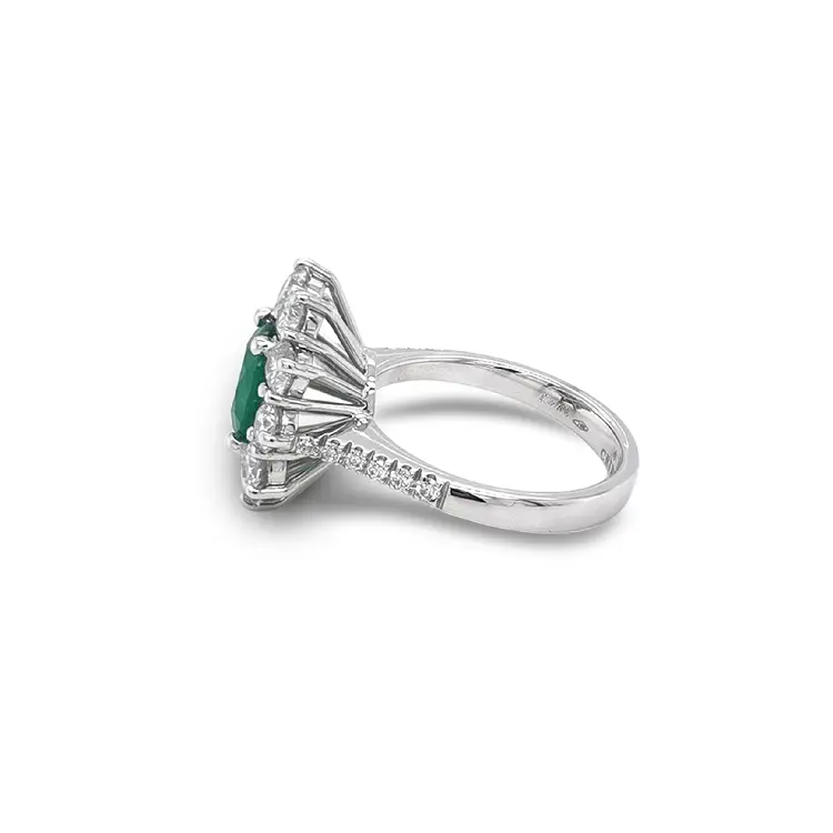 Umgeben ist der Hauptstein von 22 natürlichen Diamanten mit einem Gesamtgewicht von 1,95 ct, Farbe G und Reinheit SI. Die rund geschliffenen (Round) Steine in Größen 1,10 – 3,50 mm betonen die Leuchtkraft des Smaragds und sorgen für faszinierendes Funkeln.