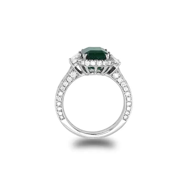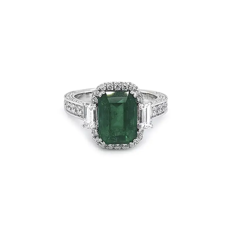 Im Mittelpunkt steht ein natürlicher Smaragd von 3,11 ct im präzisen Emerald-Schliff (10,35 × 7,34 mm), dessen intensives Grün Ruhe und Energie ausstrahlt. Zwei Baguette-Diamanten (0,67 ct) und 74 runde Diamanten (1,08 ct, F-G, VS) umgeben den Hauptstein und erzeugen ein faszinierendes Lichtspiel von Tiefe und Glanz.