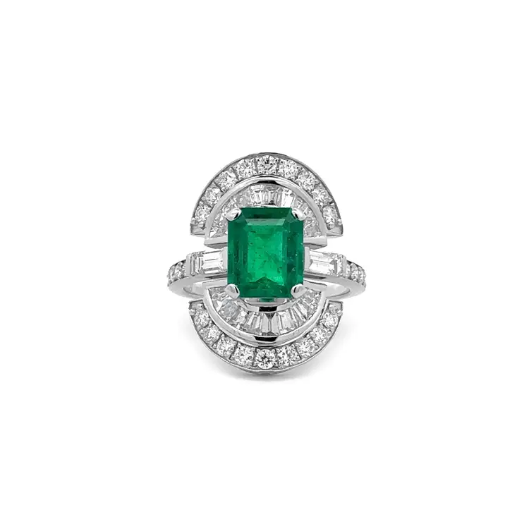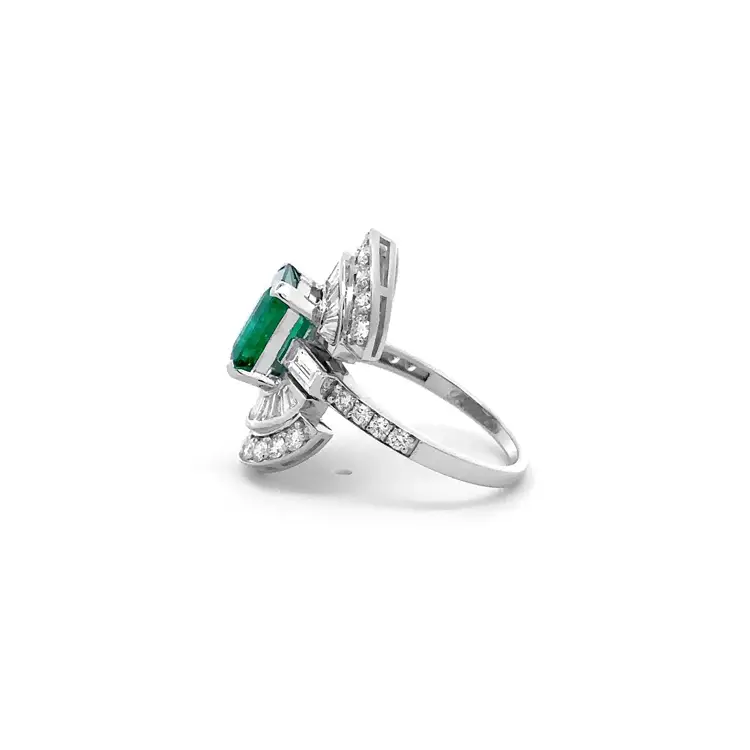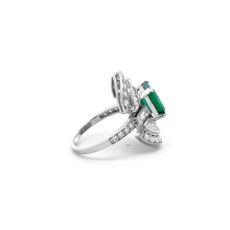 Umrahmt wird der zentrale Edelstein von 22 Diamanten im Baguette-Schliff (0,69 ct) und 26 runden Diamanten (0,88 ct), die ein leuchtendes Lichtspiel erzeugen. Die Kombination aus Farbe G und Reinheit VS verleiht den Steinen außergewöhnlichen Glanz, der im Kontrast zum tiefgrünen Smaragd besonders strahlt. Mit einem Gewicht von 5,9 g, einer Breite von 22,40 mm und einer Höhe von 7,70 mm vereint dieser Ring Kraft und Eleganz in perfekter Balance.