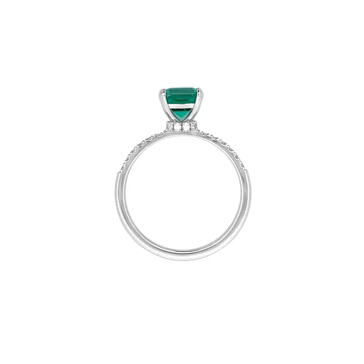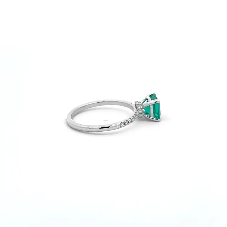 Der Smaragd (6,60 × 6,45 mm) wird von 22 runden Diamanten mit insgesamt 0,18 ct umrahmt, die auf dem Ornament von 6,65 × 6,65 mm sorgfältig von Hand gefasst sind. Jeder einzelne Stein betont die Tiefe und Leuchtkraft des Smaragds. Das Zusammenspiel von Weißgold und Smaragdgrün erzeugt ein harmonisches, edles Gesamtbild.