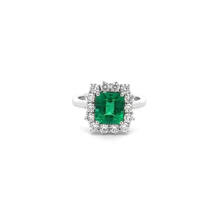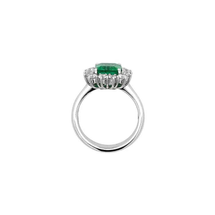 Seitlich wird der zentrale Stein von runden Diamanten mit insgesamt 0,90 ct (Farbe G, Reinheit VS) umrahmt, die dem Smaragd Licht, Bewegung und Brillanz verleihen. Der eindrucksvolle Kontrast zwischen dem lebendigen Grün des Steins und dem klaren Weißgold erzeugt ein Gefühl von raffinierter Extravaganz bei gleichzeitigem zeitlosen Stil.