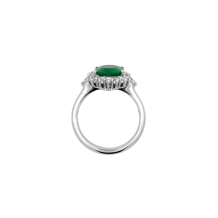 Zwei Birnen-Diamanten (insgesamt 0,29 ct, Farbe G, Reinheit VS) flankieren den Smaragd und werden von runden Diamanten (0,37 ct, Farbe G) ergänzt, die ein funkelndes Lichtspiel erzeugen. Der Kontrast zwischen dem hellen Weißgold und dem tiefen Smaragdgrün vermittelt Ausgewogenheit und Noblesse.