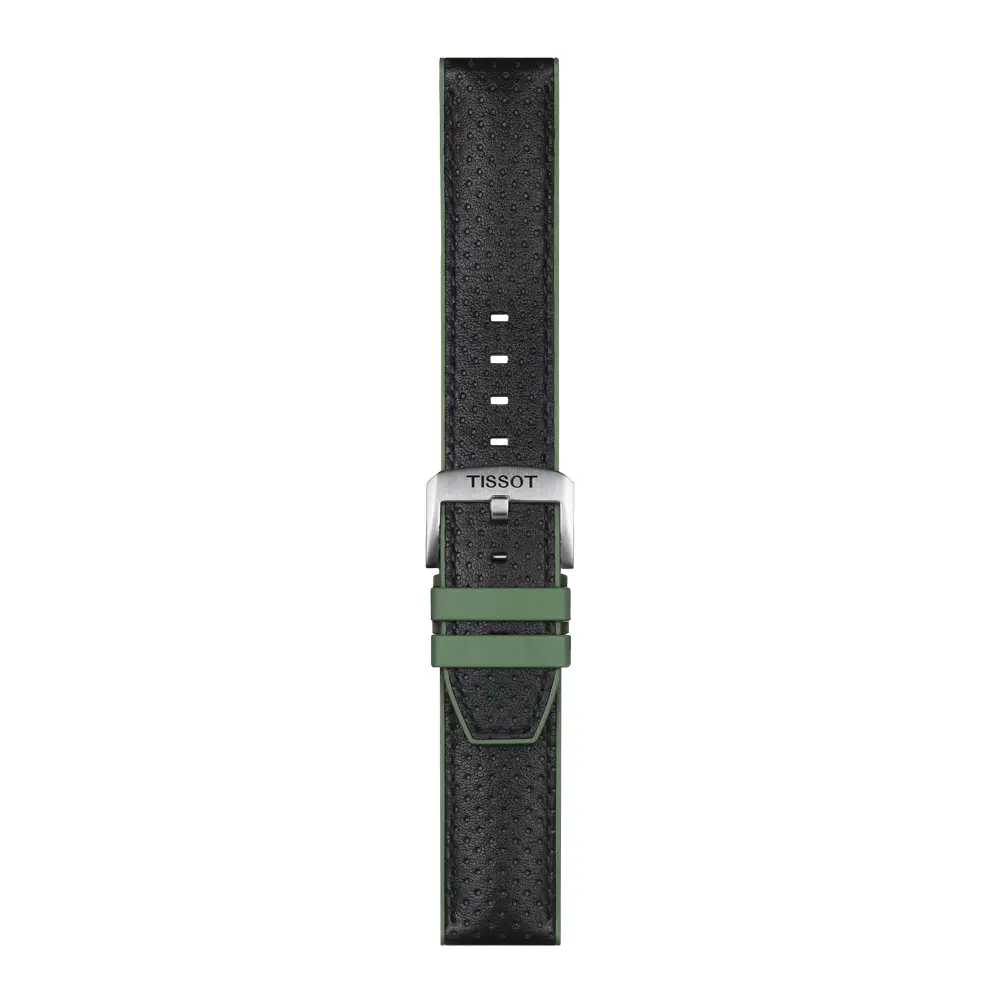 The original Tissot green and black strap T852.046.787 with a width of 22 mm is an elegant yet functional choice for selected Tissot models. It combines embossed cow leather on the top side with a durable rubber lining, offering both a refined look and strong resistance to moisture and everyday wear.