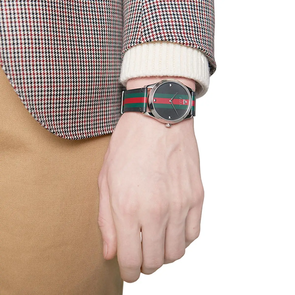 Die Gucci G-Timeless YA1264079 vereint moderne Ästhetik mit ikonischen Markenelementen. Am Handgelenk überzeugen ein rundes 38-mm-Gehäuse aus Edelstahl, Saphirglas sowie ein bicolores analoges Zifferblatt, das zeitlos wirkt und sich leicht zu Alltags- wie auch formellen Looks kombinieren lässt.