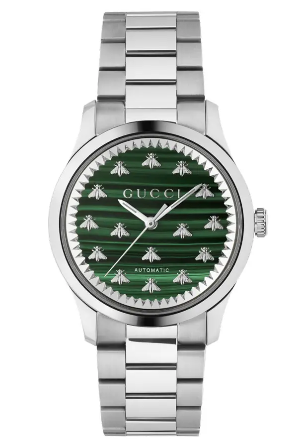 Die Gucci G-Timeless Multibee Uhr verkörpert Luxus, italienische Eleganz und schweizerische Präzision und ist ein ausdrucksstarkes Accessoire für den modernen Mann. Das malachitgrüne Zifferblatt ist mit 15 fein gearbeiteten silbernen Bienen verziert – einem der ikonischen Symbole der Marke Gucci, das für Kreativität und Stilbewusstsein steht.